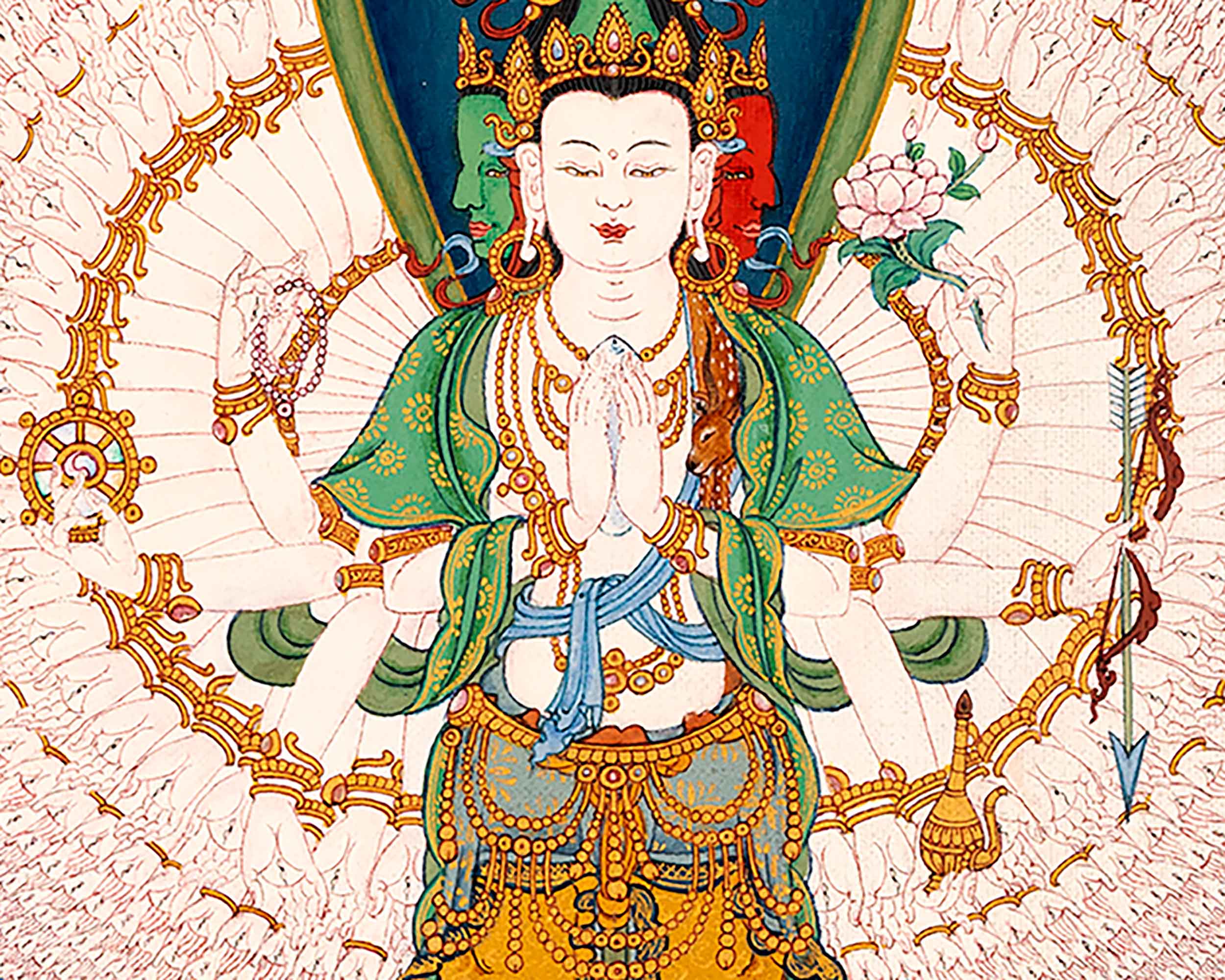 Chenrezig is renowned as the Buddha of Compassion, and his 1000-armed figure reflects his never-ending commitment to alleviating the suffering of sentient beings. In essence, he encapsulates the compassion of all 1,000 Buddhas into a single image. Chenrezig, the 1000-Armed, is the principal object of refuge in Nyungne, a deep fasting retreat practice. Keeping stringent vows, maintaining quiet, and fasting are all part of the discipline.