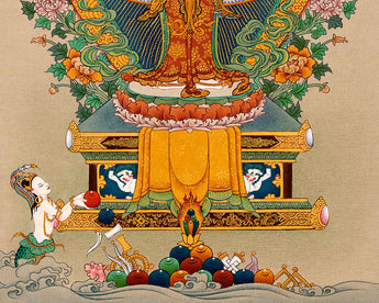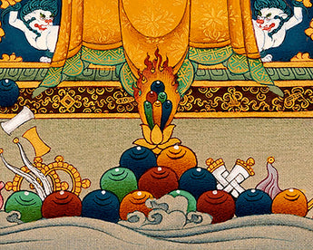 Avalokiteshvara, the Compassion Buddha, is shown in the Chenrezig 1000 Arms Thangka. He is portrayed with decorative gold and silk with vibrant patterns. Out of 1000 arms, his left hands hold an Empowerment vase, a lotus, a bow, and an arrow, while his right hands hold a crystal rosary, respectively. He possesses eleven distinct faces. Out of the three faces on his shoulders, the center one is white, the right one is green, and the left one is red. White, green, and red colors make up his central face. His white face is in the middle, on top of a green face that is red on the right and white on the left. We used acrylic colors and genuine 24K gold to hand-paint the deity on a cotton canvas.