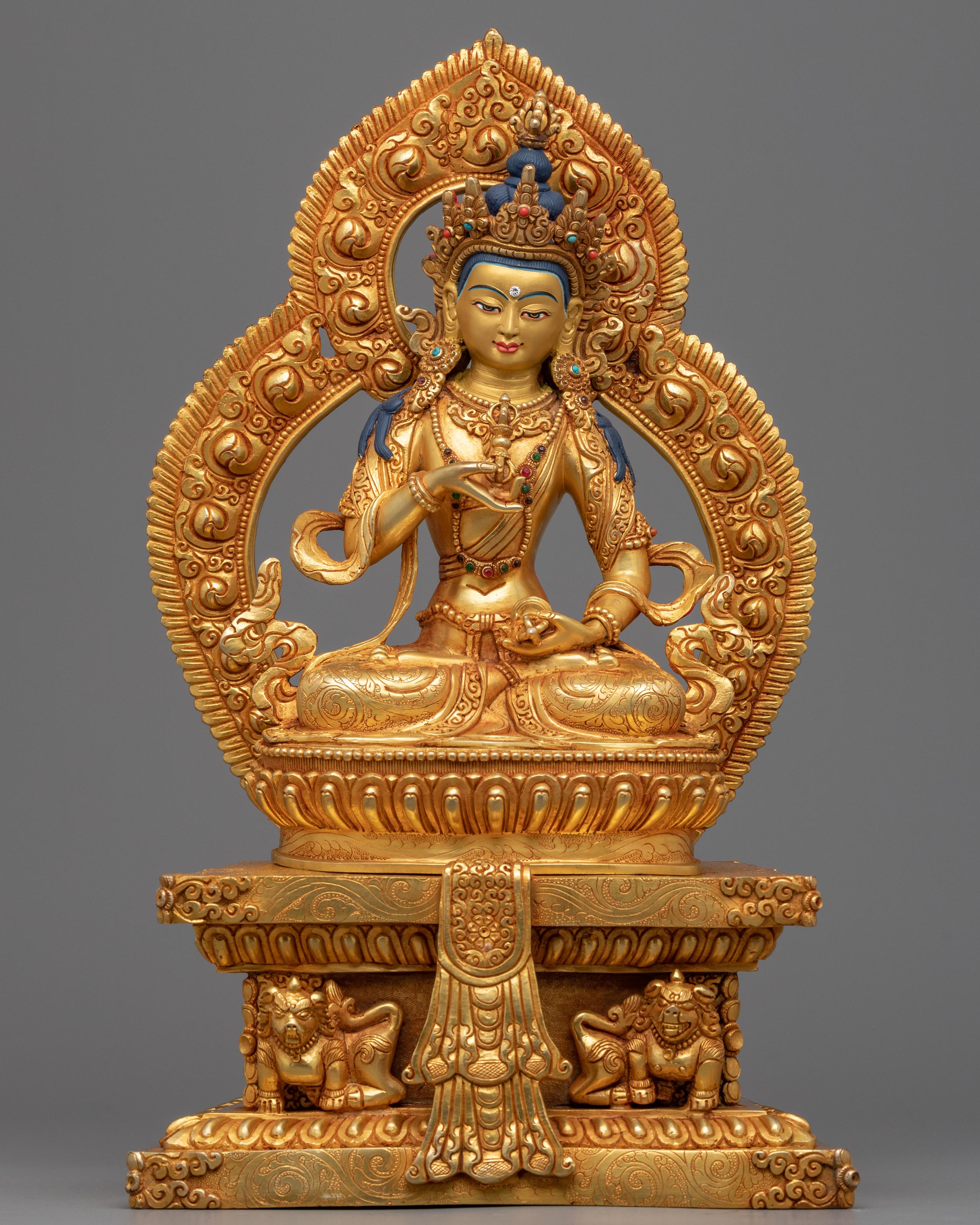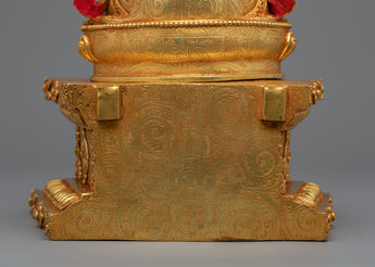 The Vajrasattva Chant Sculpture was expertly hand-carved in Nepal using traditional Himalayan art. We are the Kathmandu Valley artists whose skill in crafting vintage Vajrayana sculptures has been passed down through centuries. In this stunning art, a deity is represented serenely sitting atop a moon disc lotus throne. We diligently hand-carved the statue over a month, giving it a body of pure copper and gilding it with real 24k gold. His face and presence are illuminated by the magnificent halo and nimbus, which we have hand-carved intricate design patterns. We can assure you that the materials used to create this artwork are top-notch and will last for years.