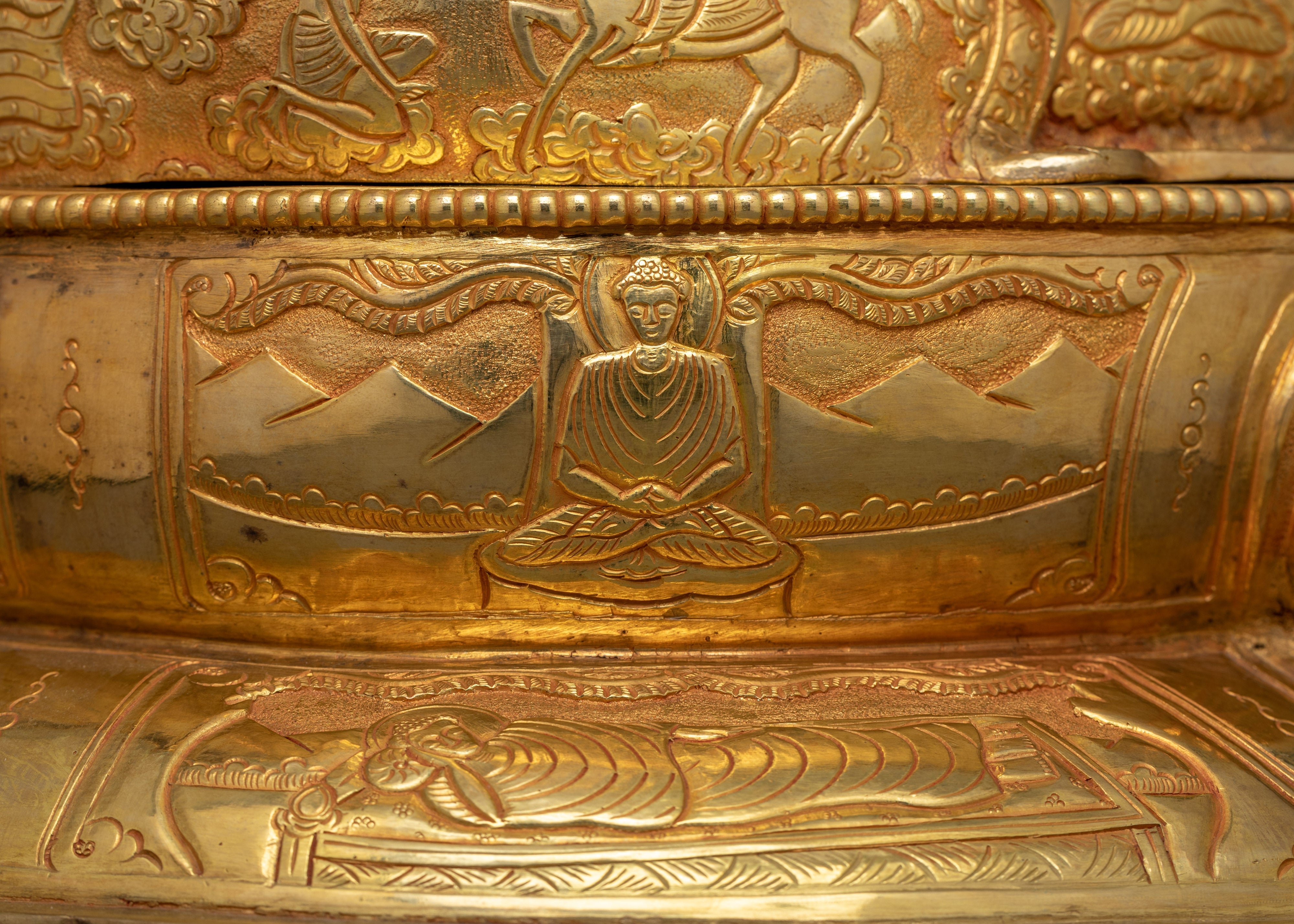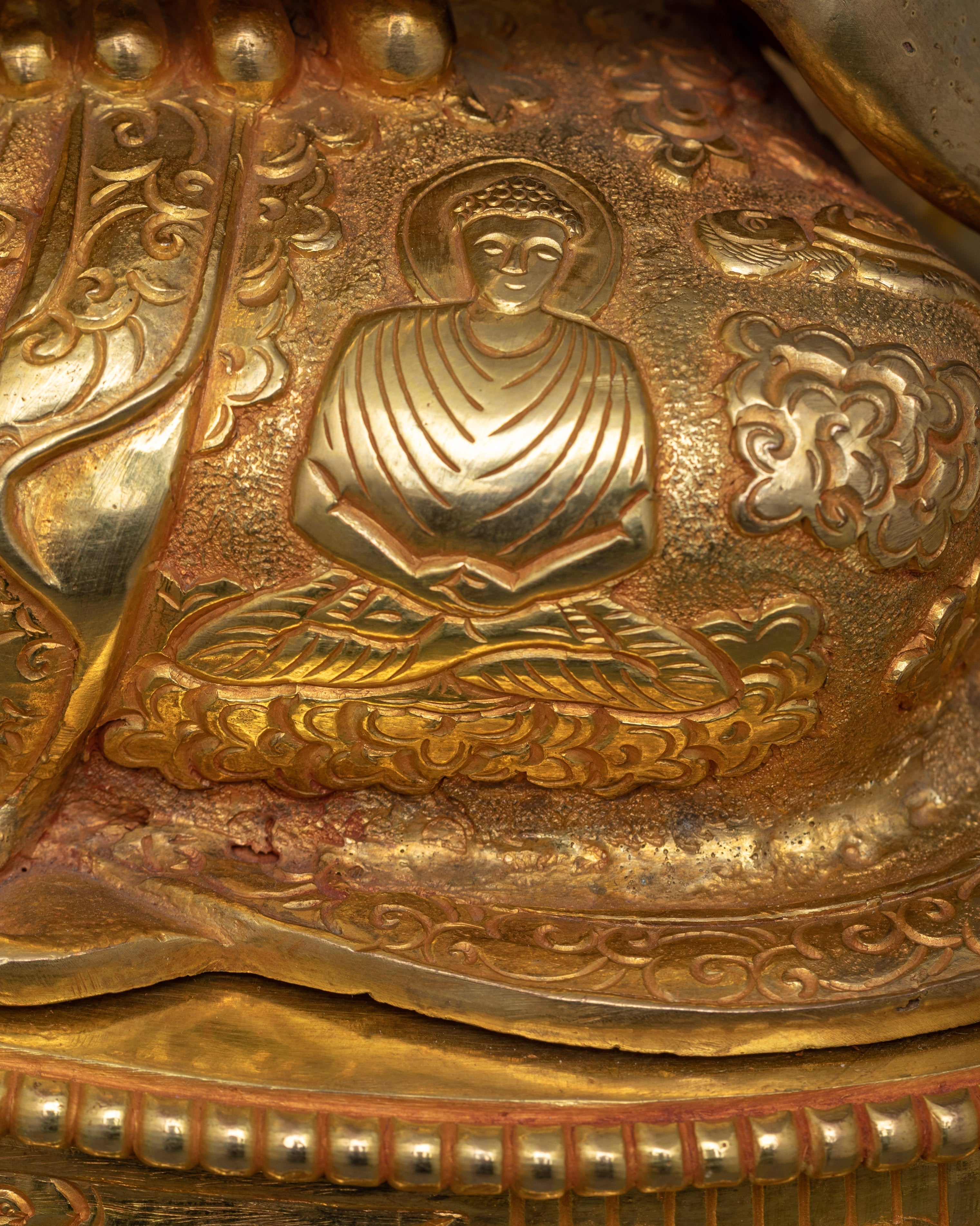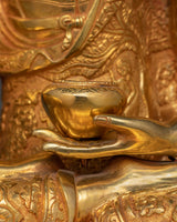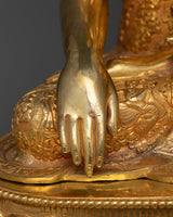 This Tranquil Shakyamuni Buddha statue stands 17.9 inches tall and exudes tranquility and wisdom. This statue, made of copper and gilded in 24K gold, is a strong emblem of enlightenment. The beautiful detailing in the gold and acrylic paints highlights Shakyamuni Buddha's serene look as he sits in deep meditation, embodying the essence of inner serenity and mindfulness.
