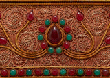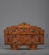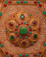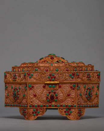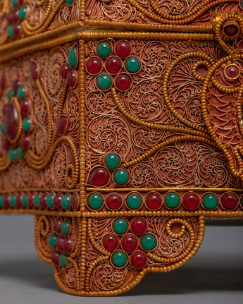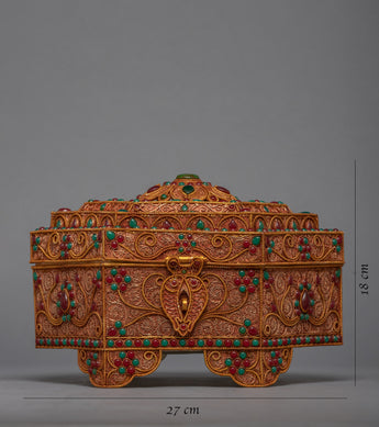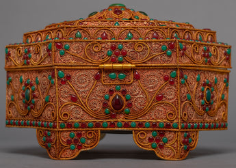 The copper body of this lovely treasure box is plated with gold. The box is made more appealing by the gemstones utilized in it. This lovely piece was made by hand in Nepal and features a roomy hollow spot where you may insert another Buddhist mantra of your choosing.