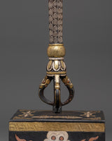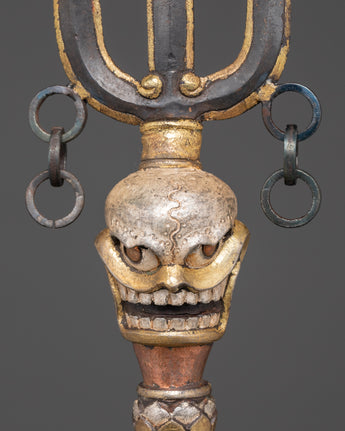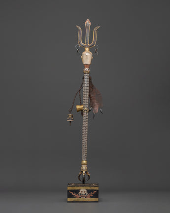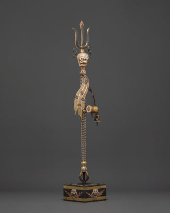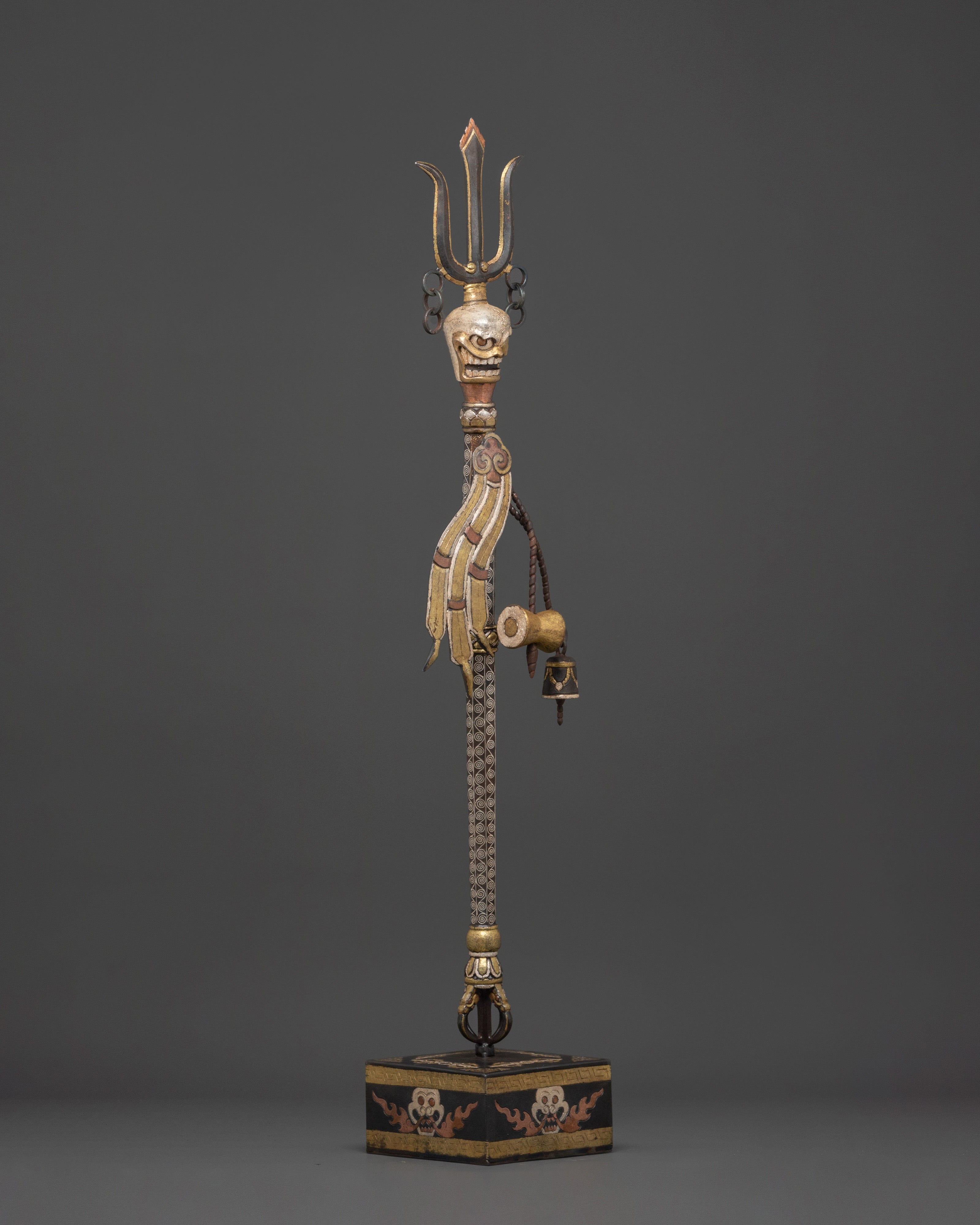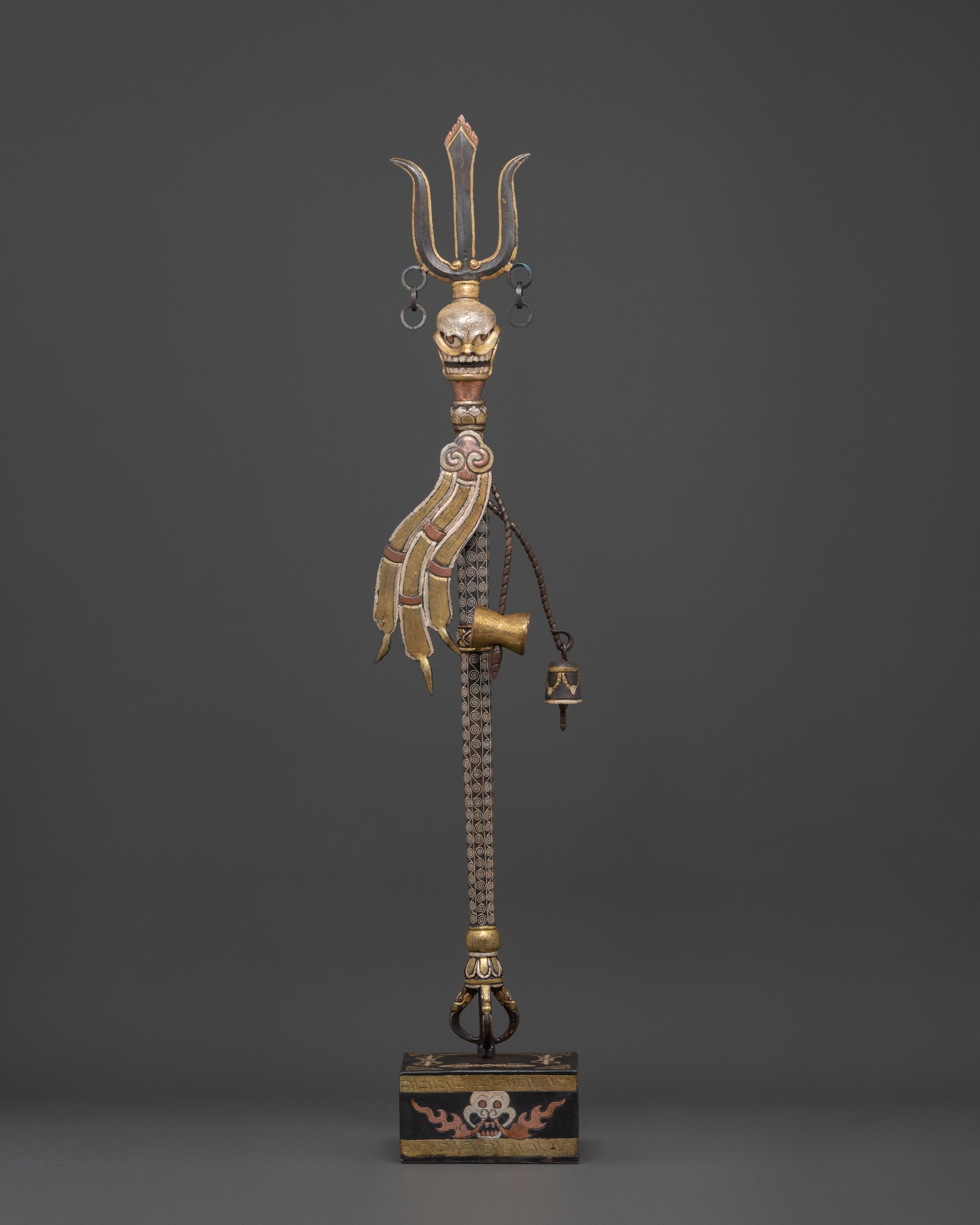 The three-pronged Trishul represents the defeat of the three poisons—ignorance, attachment, and aversion—that prevent enlightenment. It has traditionally been held by deities such as Shiva and Vajrakilaya and represents the force of divine protection as well as the balance of global elements. The Phurba, which is linked to the trident, serves as a ritual blade used to tame malevolent energy, pin them, and purify sacred locations. Together, these materials make a religious object of great value, thought to anchor spiritual energy during ceremonies and protect spaces from negative influences.