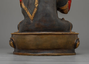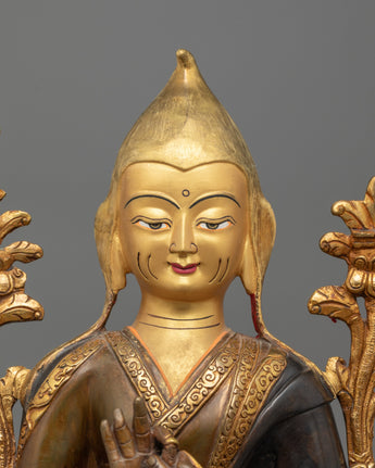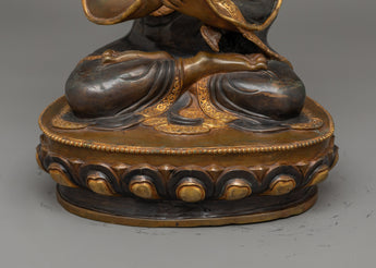 Enhance your spiritual space with our Tsongkhapa and His Disciples Statue Set, a beautiful work of celestial beauty. This set, which includes Tsongkhapa at 13.2 inches and his followers at 10.6 inches, weighs 7.66 kg and boasts oxidized copper bodies embellished with sumptuous 24K gold plating. The gold and acrylic paintings precisely depict the tranquil looks, meditative postures, and symbolic gestures of Tsongkhapa and his pupils, which represent great wisdom and compassion.