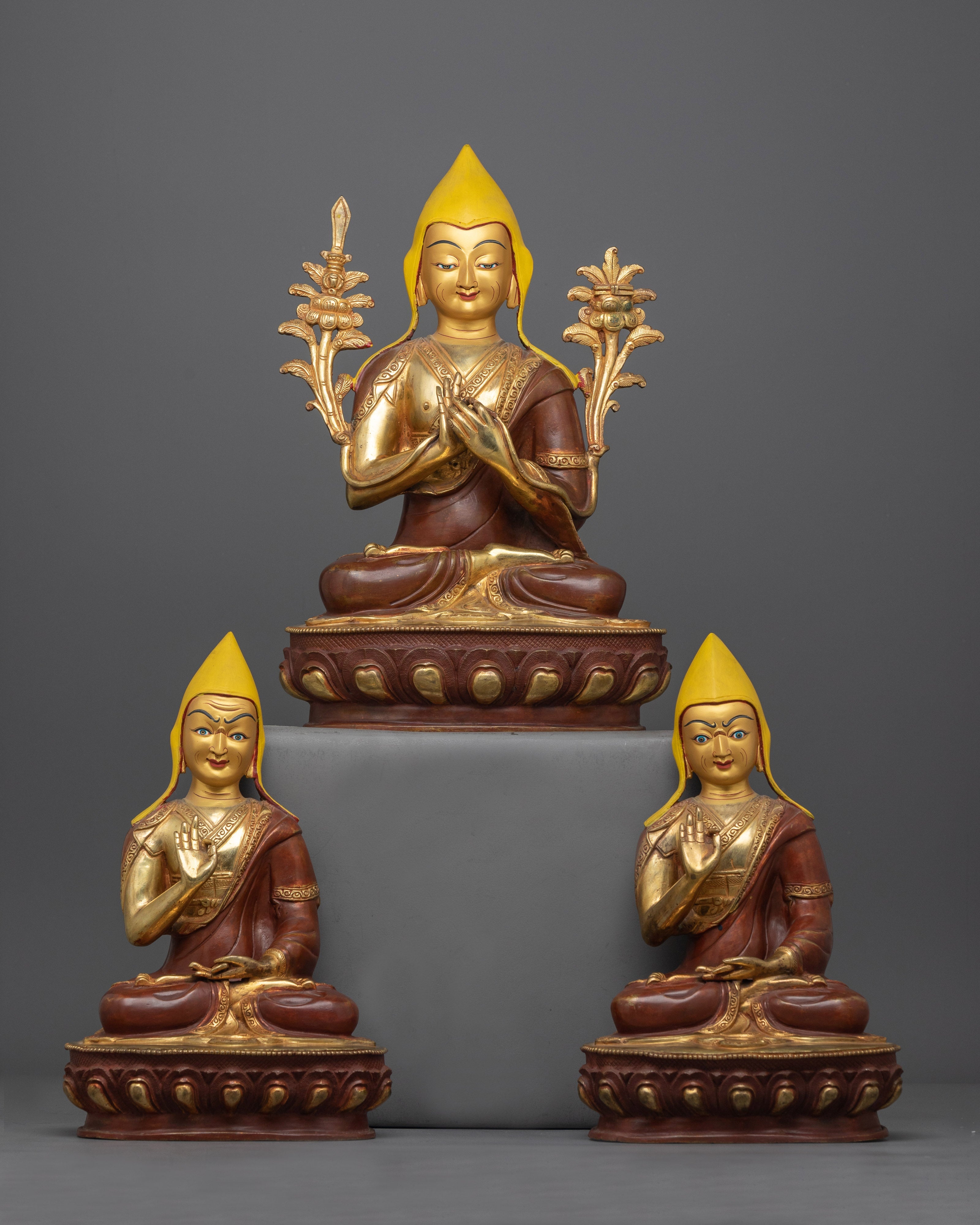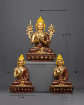 Introducing the Tsongkhapa and His disciples Statue Set, a wonderful monument to the founder of the Gelug school of Tibetan Buddhism and his two primary pupils, Je Gyaltsab and Je Khedrup. Tsongkhapa stands 34cm (13.4 inches) tall, while his students are 28cm (11 inches) tall, resulting in a harmonious ensemble that inspires devotion and respect.
