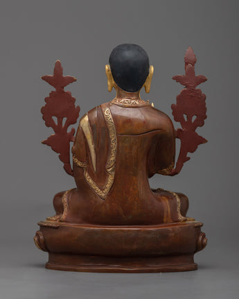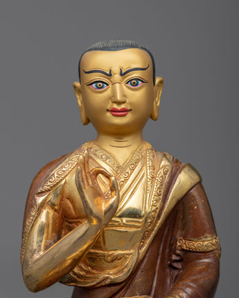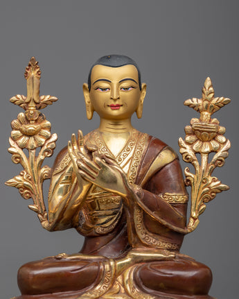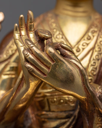 This magnificent monument comes from the heart of Nepal, a testament to the talented hands of artists. It's meticulously fashioned from oxidized copper and embellished with bright 24k gold gilding, lit up by beautifully hand-painted acrylic accents. When you invite this incarnation of wisdom and compassion into your home, you are receiving the collective blessings of Tsongkhapa and his disciples, who will guide you on your spiritual journey.