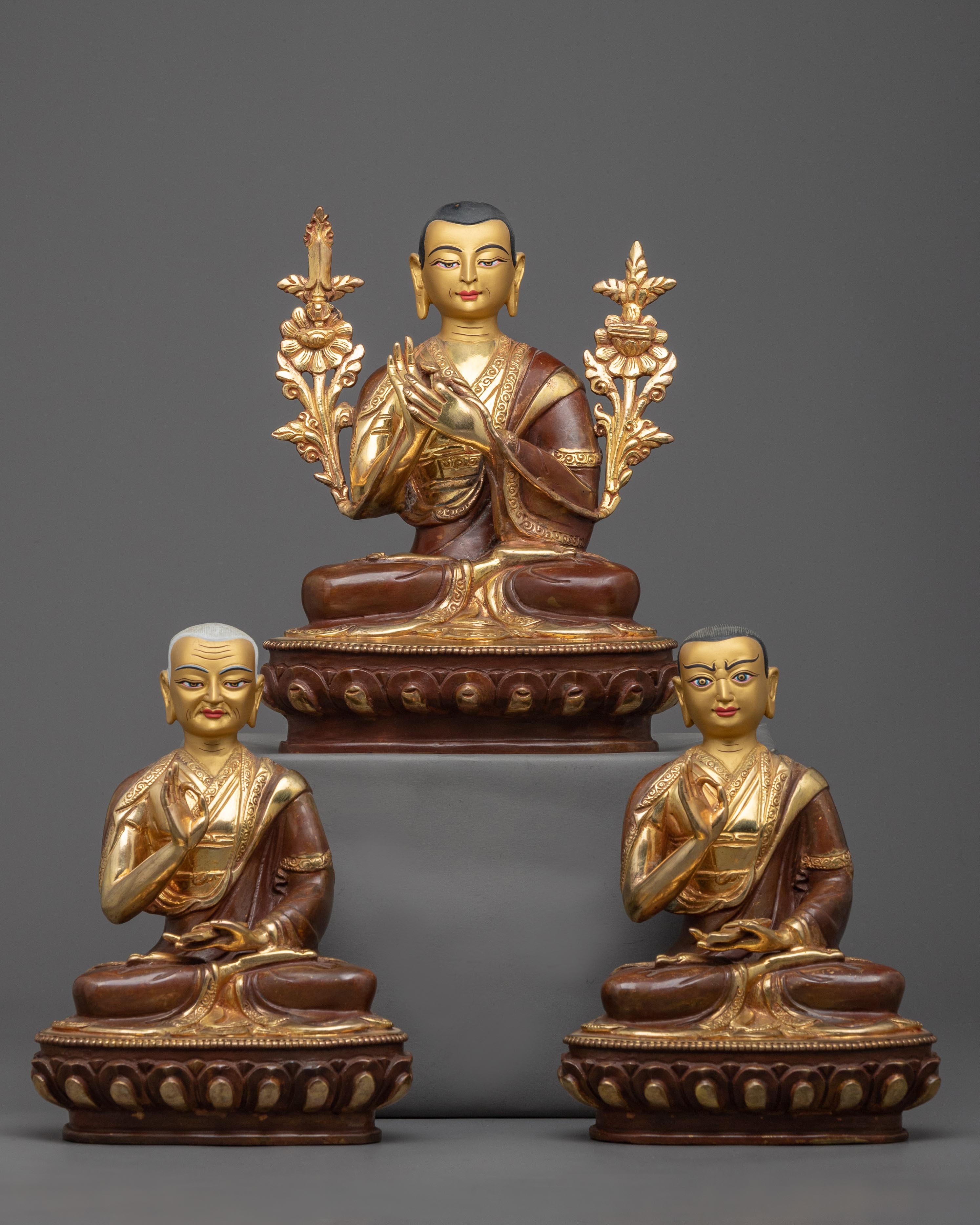 The founder of the Gelug school of Tibetan Buddhism, Je Tsongkhapa, is regarded for his unrivaled intellect, discipline, and teachings on the "path of reasoning." They establish an enlightenment triad with his students, Gyaltsab Je and Khedrup Je. The Migtsema mantra invokes their blessings, awakens inner insight, and guides the soul down the path of compassion and understanding.