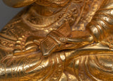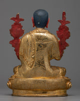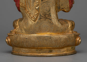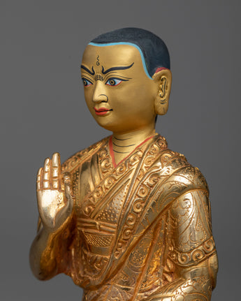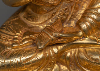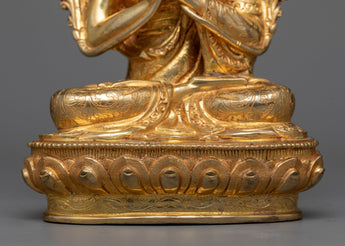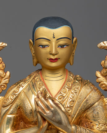 We present the Tsongkhapa with the Disciples Statue, a sacred ensemble showing the famous founder of the Gelug school of Tibetan Buddhism with his two devoted followers. This statue, standing 8.6 inches tall and weighing 5.05 kg, represents Tsongkhapa's significant contribution on Buddhist doctrine. The copper body of this statue is lavishly coated in 24K gold, with gold and acrylic paintings highlighting the delicate details of the characters' emotions, costumes, and poses.