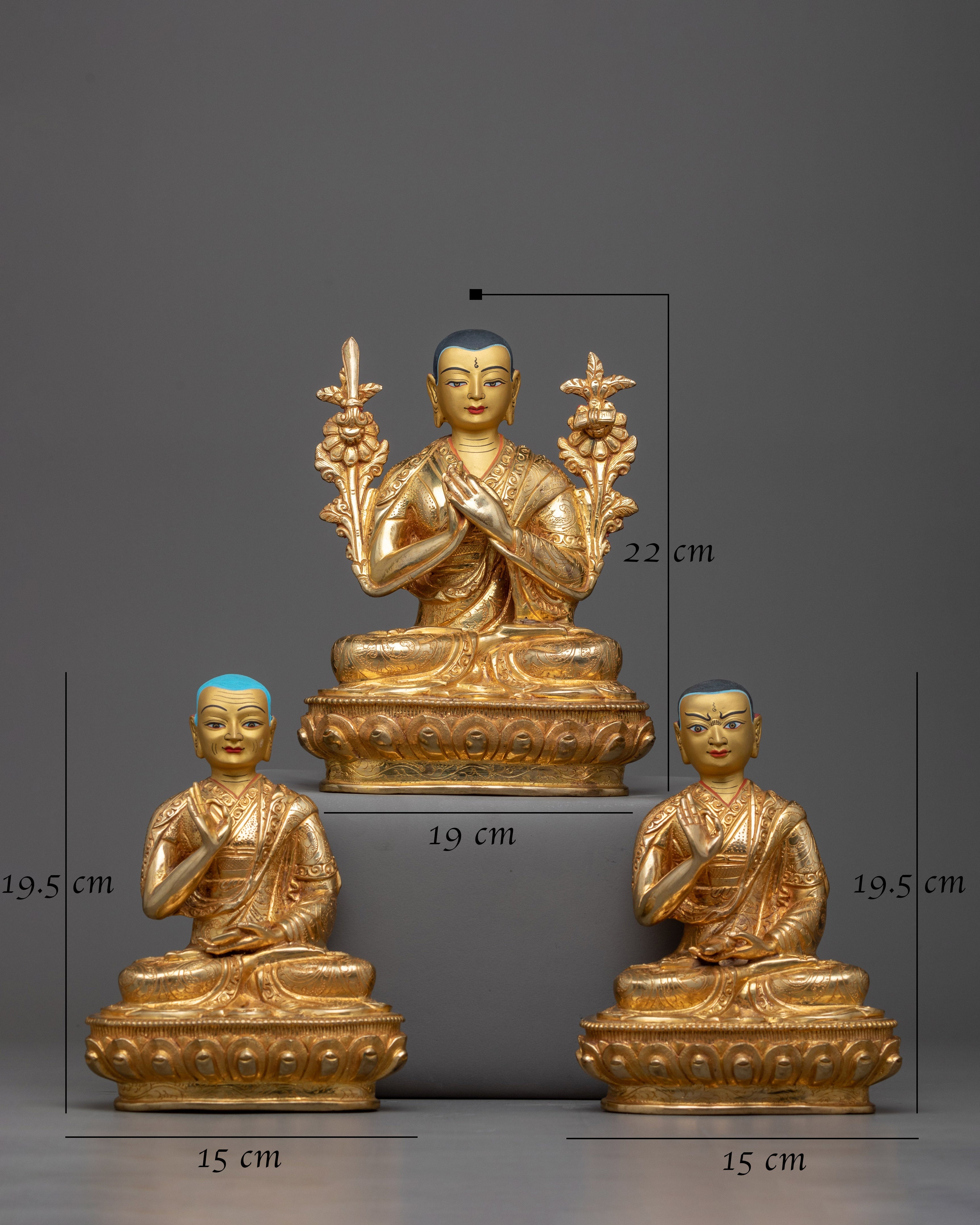 The statue's golden shine echoes the enlightened wisdom that Tsongkhapa spread, while the presence of his pupils, Gyaltsab Je and Khedrup Je, represents the transmission of his teachings through generations. The intricate painting and gilding work bring to life Tsongkhapa's gentle smile and his disciples' attentive gazes, a trio in harmonious pursuit of spiritual knowledge.