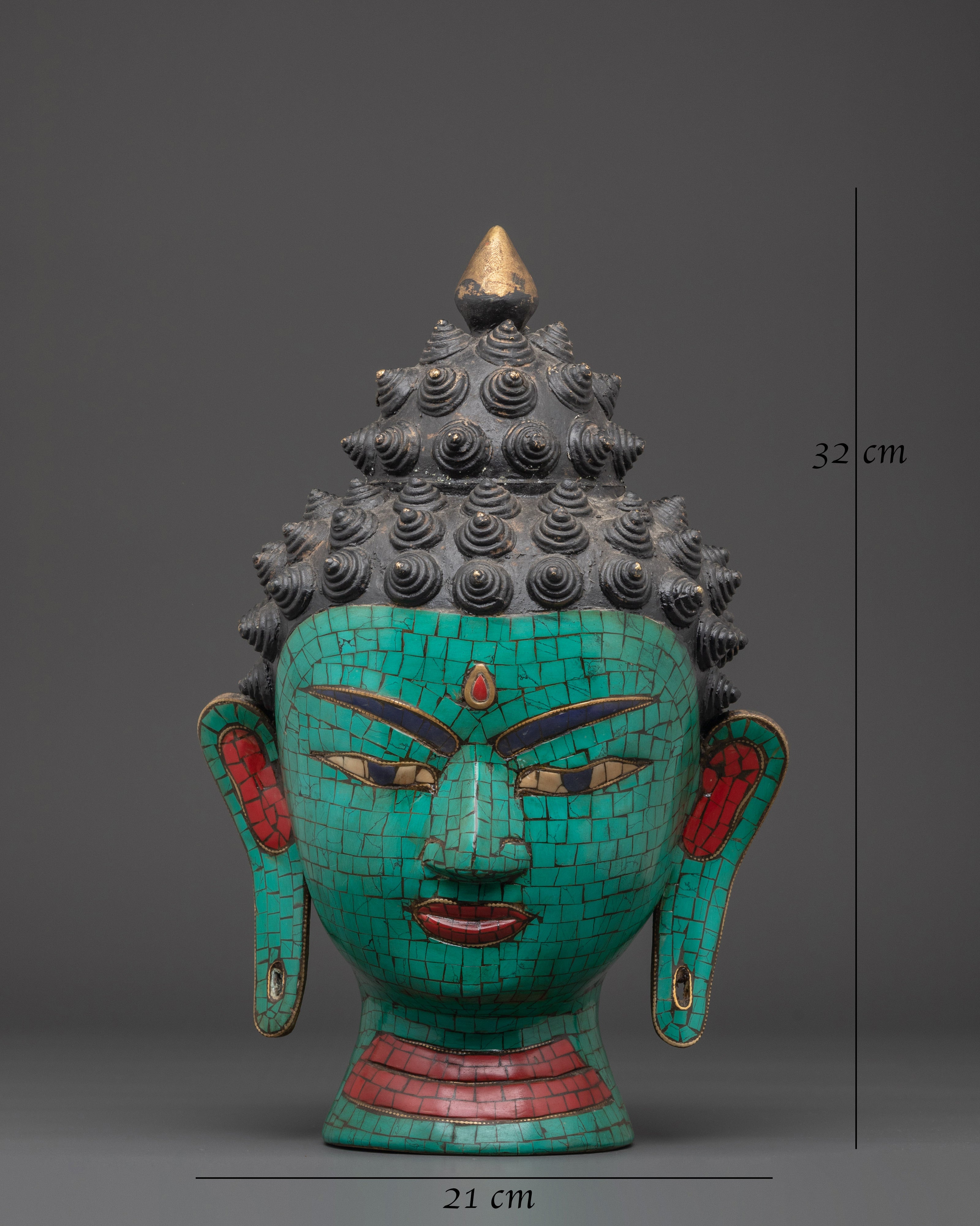 This stunning Turquoise Buddha Head Statue is a powerful representation of peace, wisdom, and enlightenment. Handcrafted from brass and adorned with intricate inlays of turquoise and coral stones, it radiates spiritual energy and serves as an inspiring centerpiece for your home, altar, or meditation room. At 32cm in height, this Buddha head carries a commanding presence that enhances both spiritual practice and interior décor.