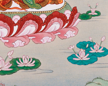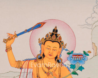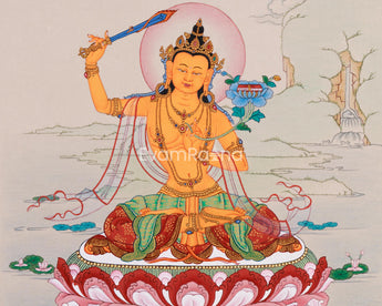 Embrace the elegance of our Unique Manjushri Thangka, featuring a small and one-of-a-kind depiction of the Buddhist deity Manjushri. Enhance your spiritual practice with this exclusive piece, crafted with intricate detail. Made for the discerning customer who appreciates the art, literature, and fashion of the world.