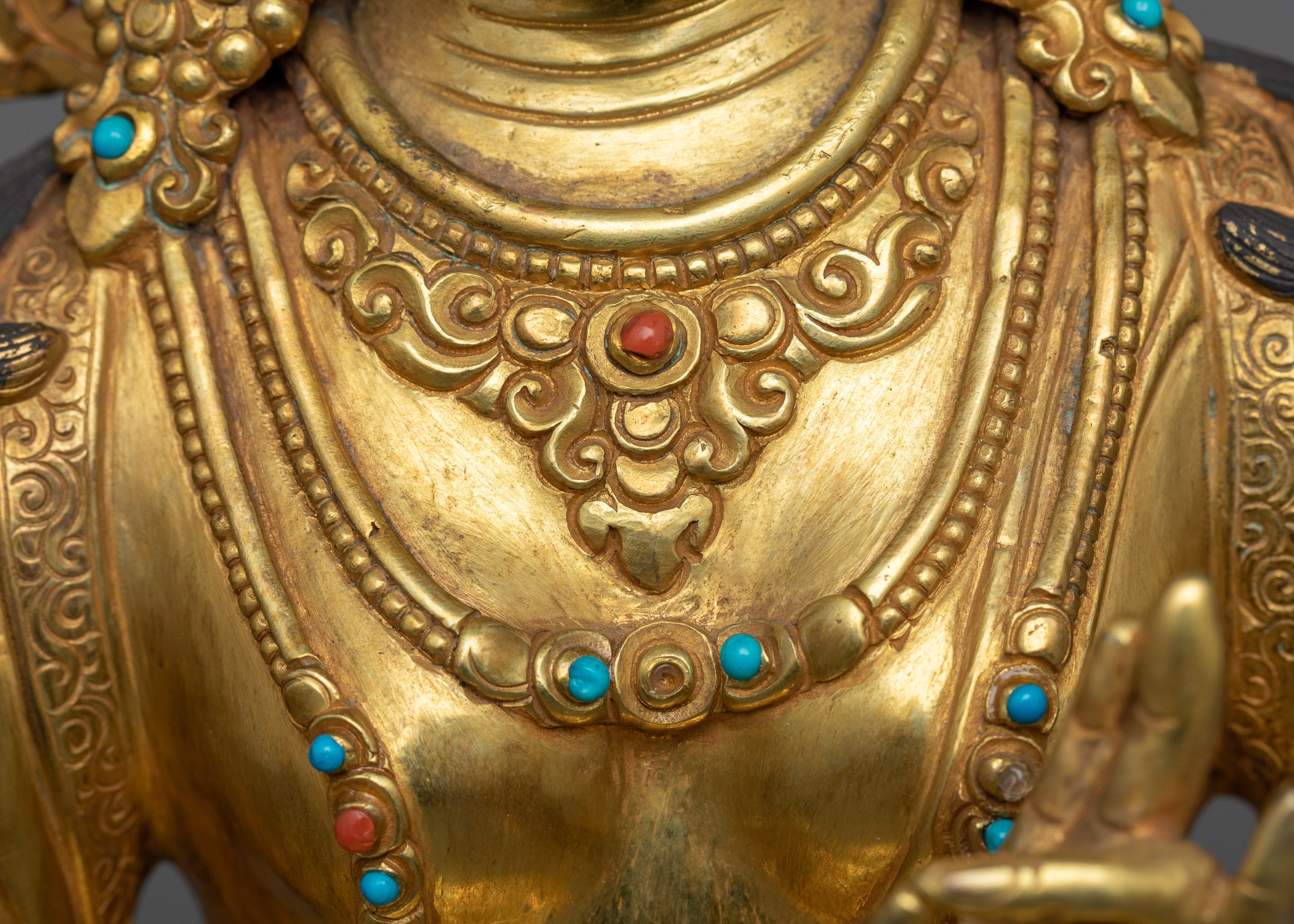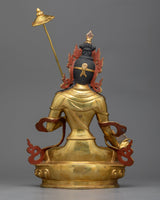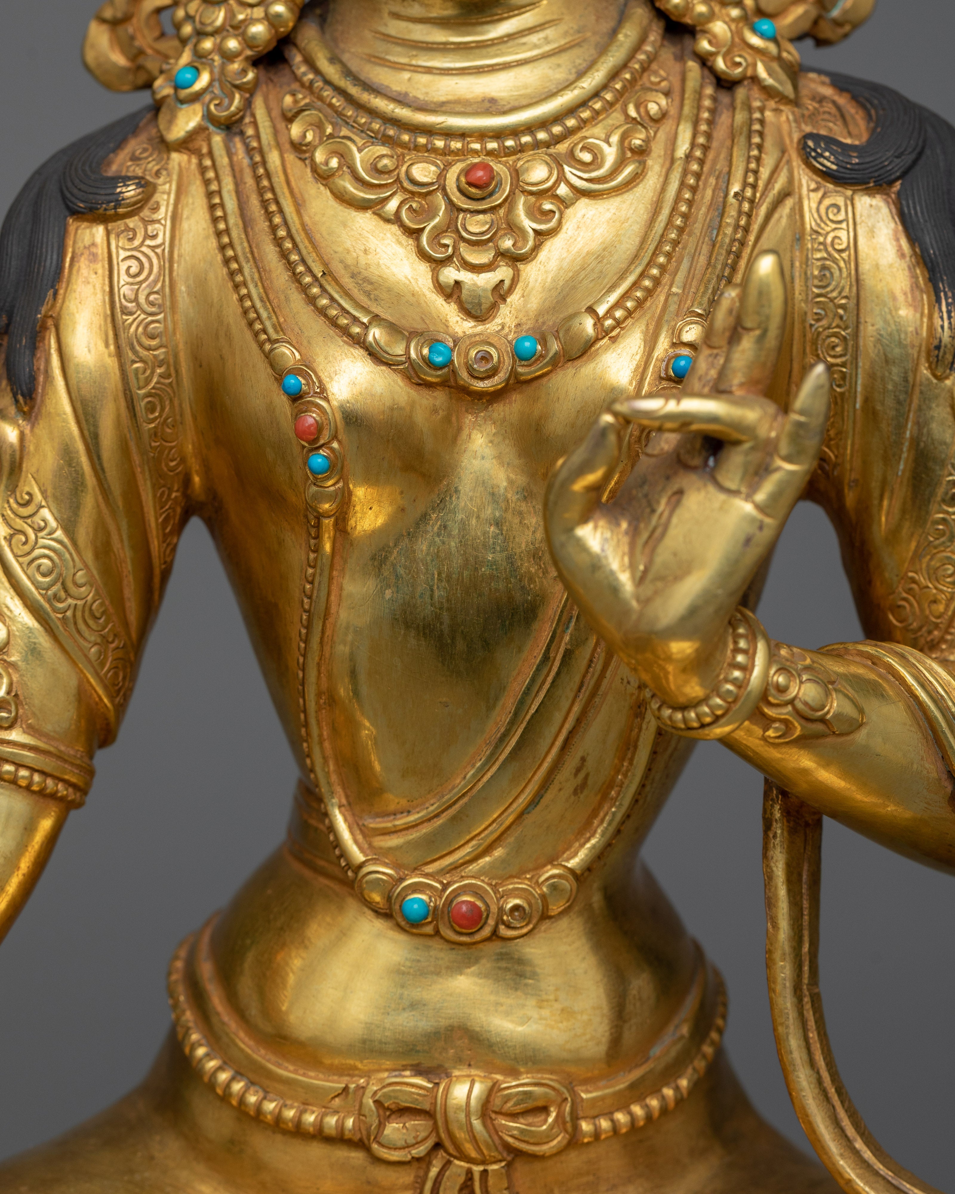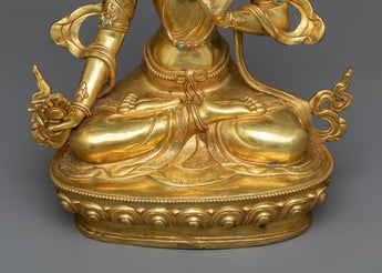 The Ushnisha Sitatapatra Statue is a magnificent portrayal of the 'Goddess of the White Parasol' from our premium collection. This statue weighs 3.08 kg and stands proudly at 14.5 inches with a base of 9 inches, indicating its significant presence and craftsmanship. This statue, masterfully created from a copper body and lavishly gilded in 24K gold, is not only an excellent piece of spiritual art but also a symbol of profound protection and spiritual resilience.