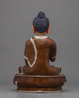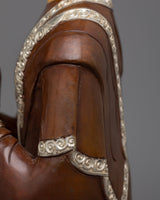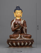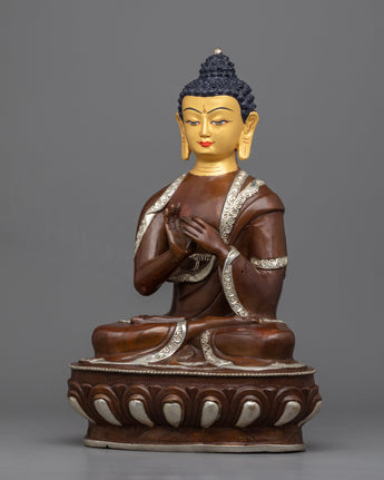 We have masterfully hand-carved the Vairocana Buddha statue in the traditional Himalayan style. The figure was hand-carved of oxidized copper and partially gilded with silver and gold. In the statue, the primordial Buddha is depicted sitting on a moon disc lotus seat, symbolizing purity and enlightenment. The Buddha performs the 'Dharmachakra mudra' with his two hands representing the teachings of the Buddha and the path to enlightenment. The statue is full of intricate patterns and motifs that our artists carved out over the course of several months and is beautifully painted with acrylic colors, enhancing its beauty.