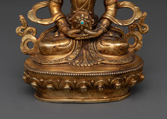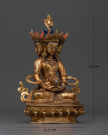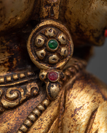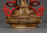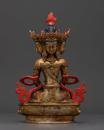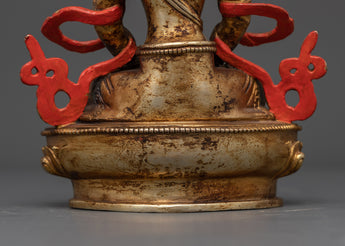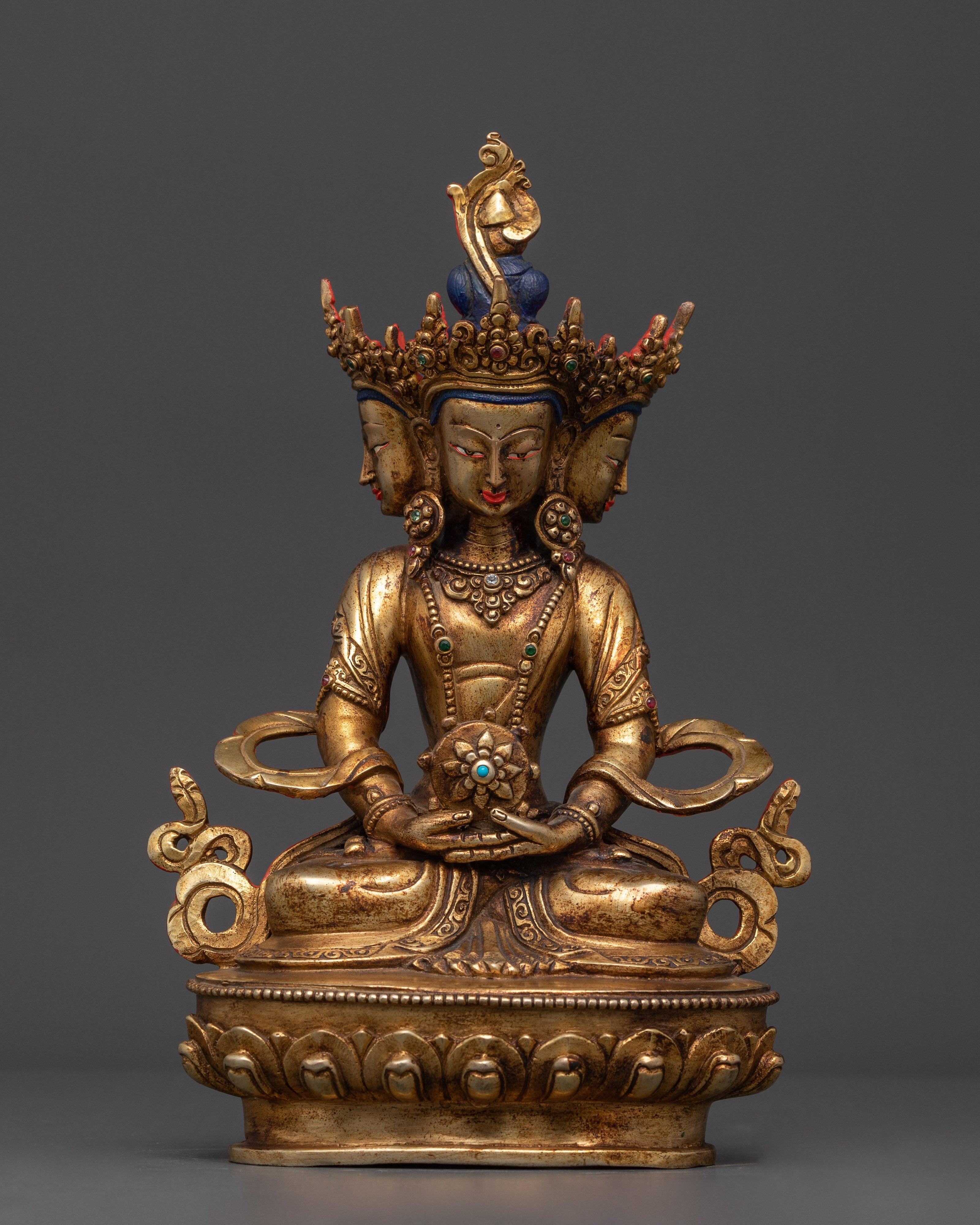 The Vairocana Handmade Antique Touch Statue is a 24 cm tall piece of finely carved copper that is gilded in 24K gold. This statue brings knowledge and calmness into any area as it depicts the calm and enlightened face of Vairocana Buddha. The sculpture has a timeless elegance that blends well with any setting thanks to the colorful acrylic paintings and antique finish.
