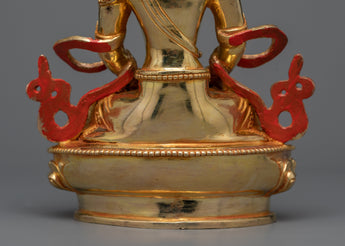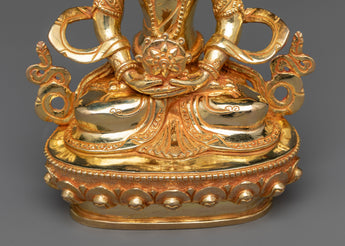 Presenting the Vairocana Kunrig Statue is a magnificent representation of the prehistoric Buddha Vairocana, who is honored in Buddhist tradition for his function in shedding knowledge and wisdom throughout the cosmos. This statue, which measures 9.4 inches in height by 6.2 inches at the base and weighs 1.90 kg, represents the profound and all-encompassing character of Vairocana's teachings. This sculpture, which is made of a copper body and is embellished with 24K gold plating and intricate paintings in gold and acrylic, perfectly encapsulates Vairocana's enlightenment and all-encompassing presence.