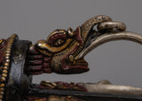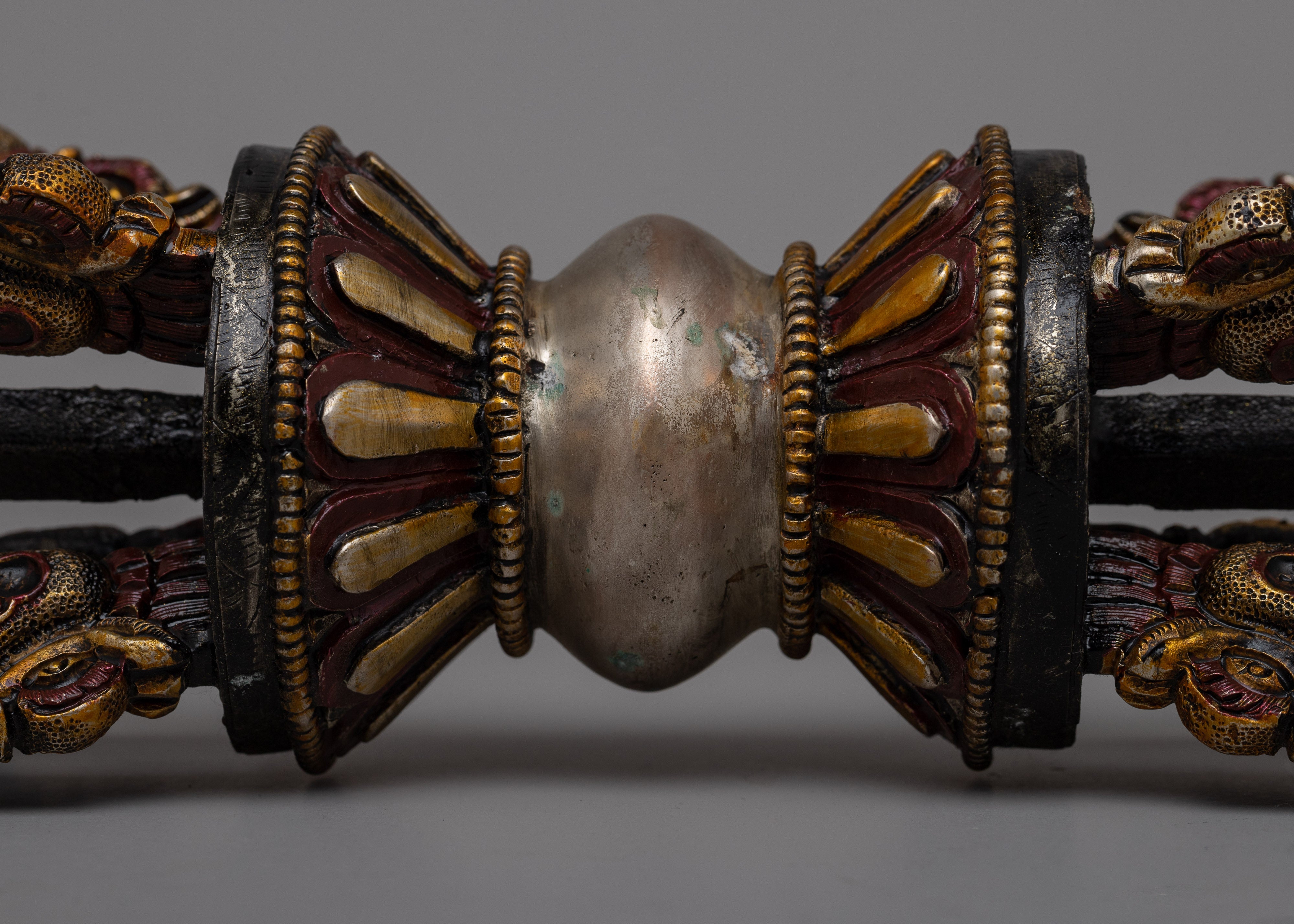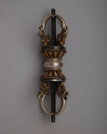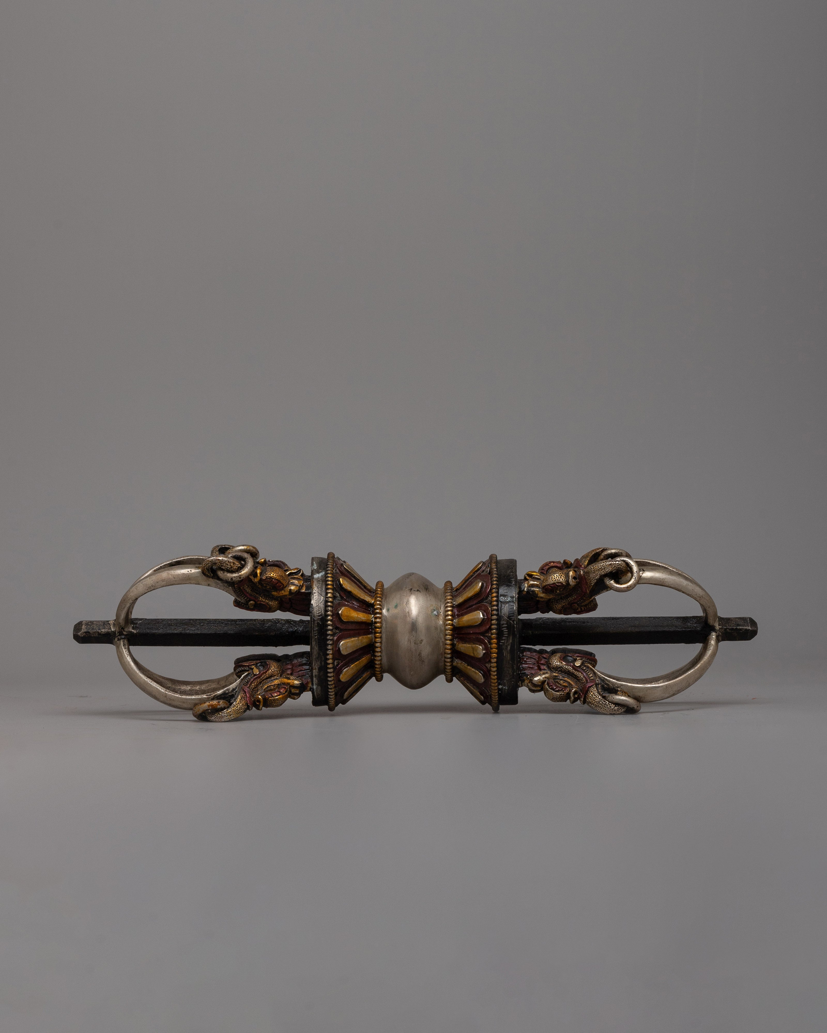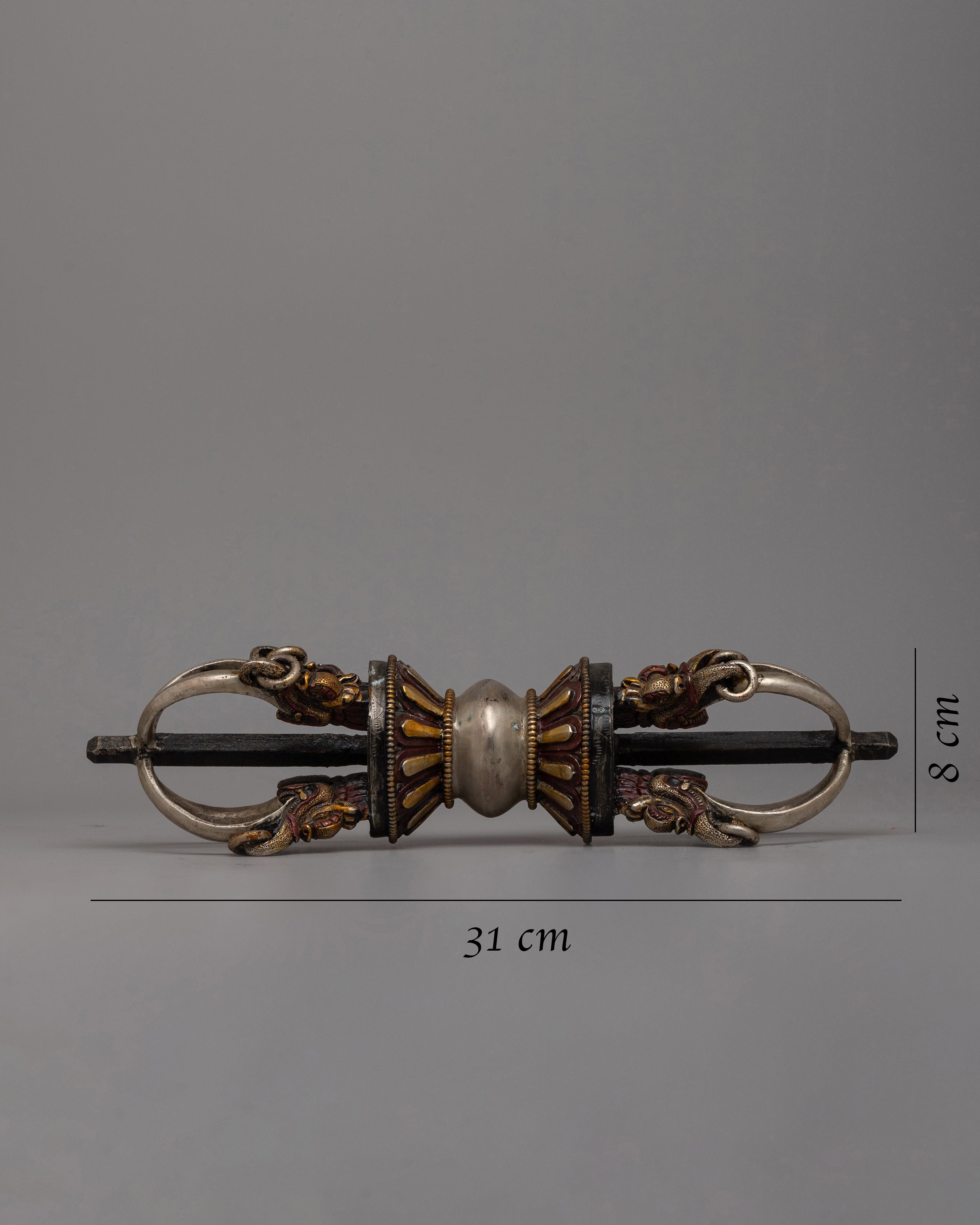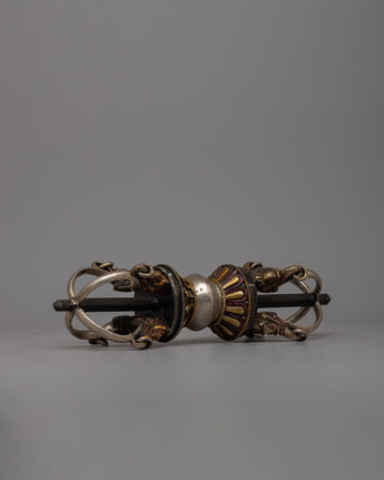The Vajra Dorje, a symbol of spiritual force and enlightenment in Tibetan Buddhism, is carefully handcrafted on a copper body, demonstrating excellent craftsmanship and attention to detail. This sacred object, embellished with both silver and 24k gold plating, represents the unification of wisdom and compassion, as reflected by the contrasting metals.