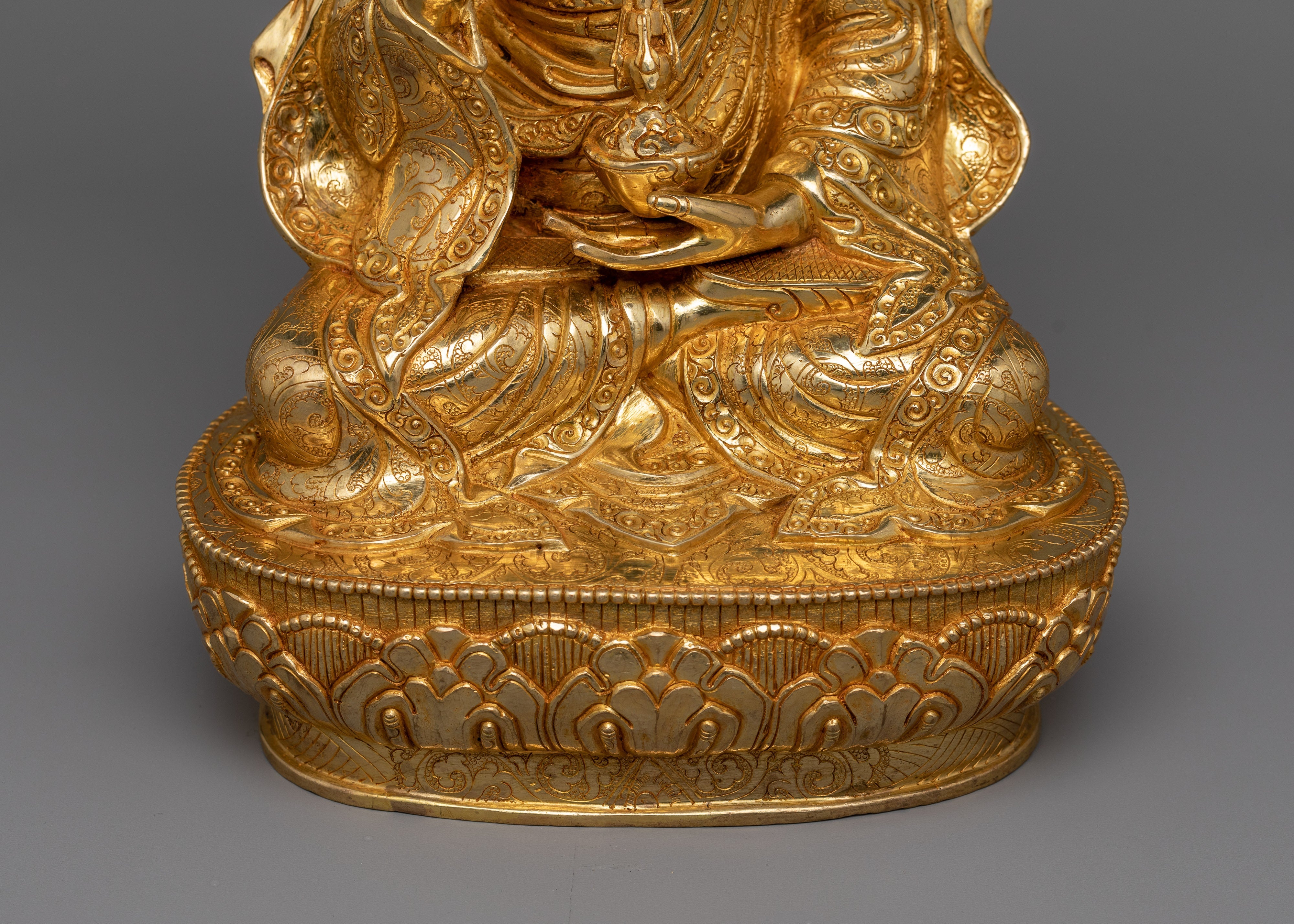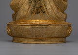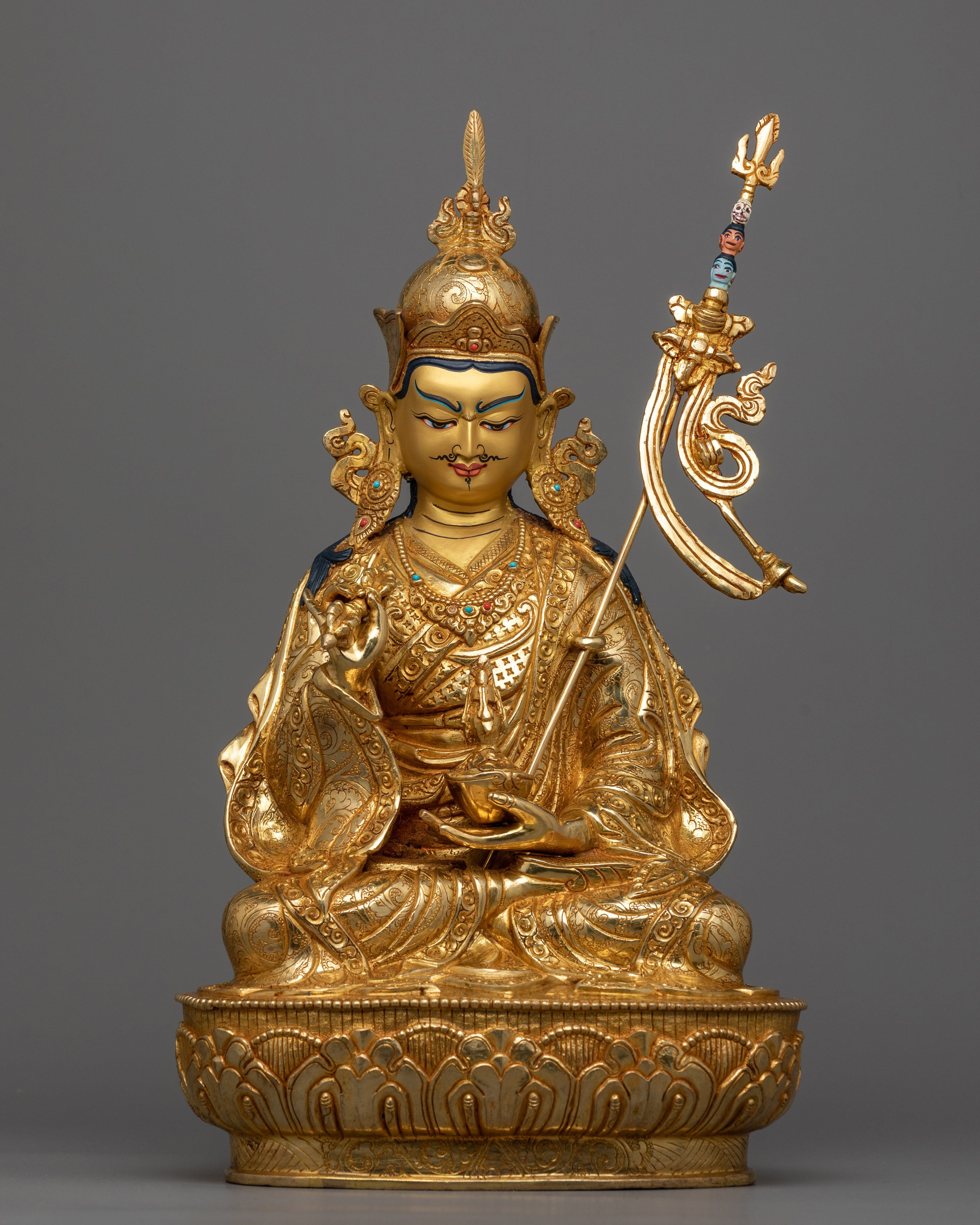 Introducing the Vajra Guru Rinpoche Sculpture, a stunning depiction of the legendary tantric master who was instrumental in bringing Buddhism to Tibet, Guru Rinpoche, also known as Padmasambhava. This sculpture, which stands 14.6 inches tall with an 8.7-inch base and weighs 4.60 kg, is proof of the great influence and eternal teachings of Guru Rinpoche. Made of a copper body gilded in 24 carat gold and embellished with paintings in gold and acrylic, it embodies the vibrant spirit and enlightened presence of this spiritual trailblazer.