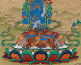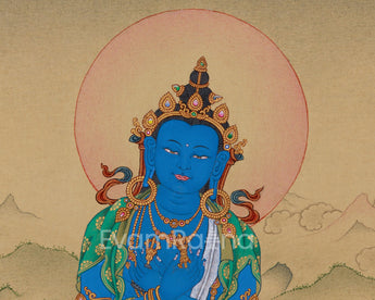 Introducing the stunning Vajradhara Art thangka, a breathtaking depiction of the primordial Buddha in Vajrayana Buddhism. Made with natural stone colors and 24K gold on cotton canvas, this thangka brings the deity to life in stunning detail through a blend of ancient materials and exceptional workmanship. The rich, deep hues of the natural stone colors, known for their spiritual significance, are elevated by the addition of 24K gold, symbolizing wisdom, purity, and enlightenment.