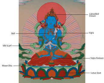 Vajradhara is rendered with a deep blue body, symbolizing infinite space and the vastness of the enlightened mind. He is seated in the vajra posture on a lotus seat, representing purity and spiritual awakening. His hands are crossed in the signature tantric mudra, holding a bell in the right hand and a vajra in the left, symbolizing the inseparable union of wisdom and method. The intricately detailed five-jeweled crown on his head marked his enlightened status. This thangka is a visually stunning and spiritually potent centerpiece, ideal for meditation rooms, altars, or sacred collections.