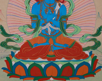 Radiating the ultimate embodiment of primordial enlightenment, this Vajradhara Buddha Art thangka is a powerful representation of the supreme tantric Buddha, Vajradhara, the source of all Buddhist teachings. It symbolizes the union of wisdom and compassion, representing the Buddha's original nature. The thangka is beautifully hand-painted using vibrant acrylic colors on soft cotton canvas. It’s enhanced with 24K gold detailing, showcasing the traditional Karma Gadri style that truly brings it to life.