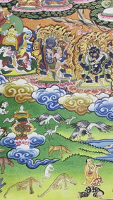 Golden hues dance upon the intricately painted cotton canvas, illuminating the enlightened lineage that flows through each stroke. The artist's dedication echoes through the delicate rendering of intricate robes and the meticulous attention to each symbolic motif, inviting you to delve into the rich tapestry of Buddhist heritage. As you ponder the artist's devotion, consider inviting this embodiment of wisdom into your space – an evocative reminder of the profound journey toward enlightenment. Elevate your spiritual practice or home ambiance with this captivating masterpiece – a true embodiment of artistry and spirituality.