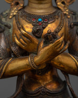 The 24.5 cm tall Vajradhara Oxidized Antique Touch Statue is carefully crafted of finest copper and has an antique and oxidized appearance. With its ability to evoke wisdom and enlightenment, this statue perfectly depicts the profound and tranquil nature of Vajradhara, making it an ideal complement to any environment. His function as the embodiment of primordial wisdom is symbolized by the deity's peaceful face and distinctive oxidized finish, which are accentuated by the intricate carvings.