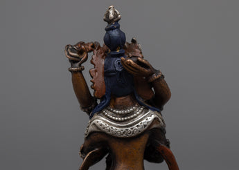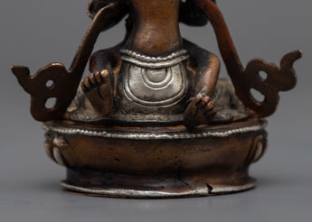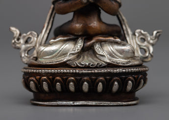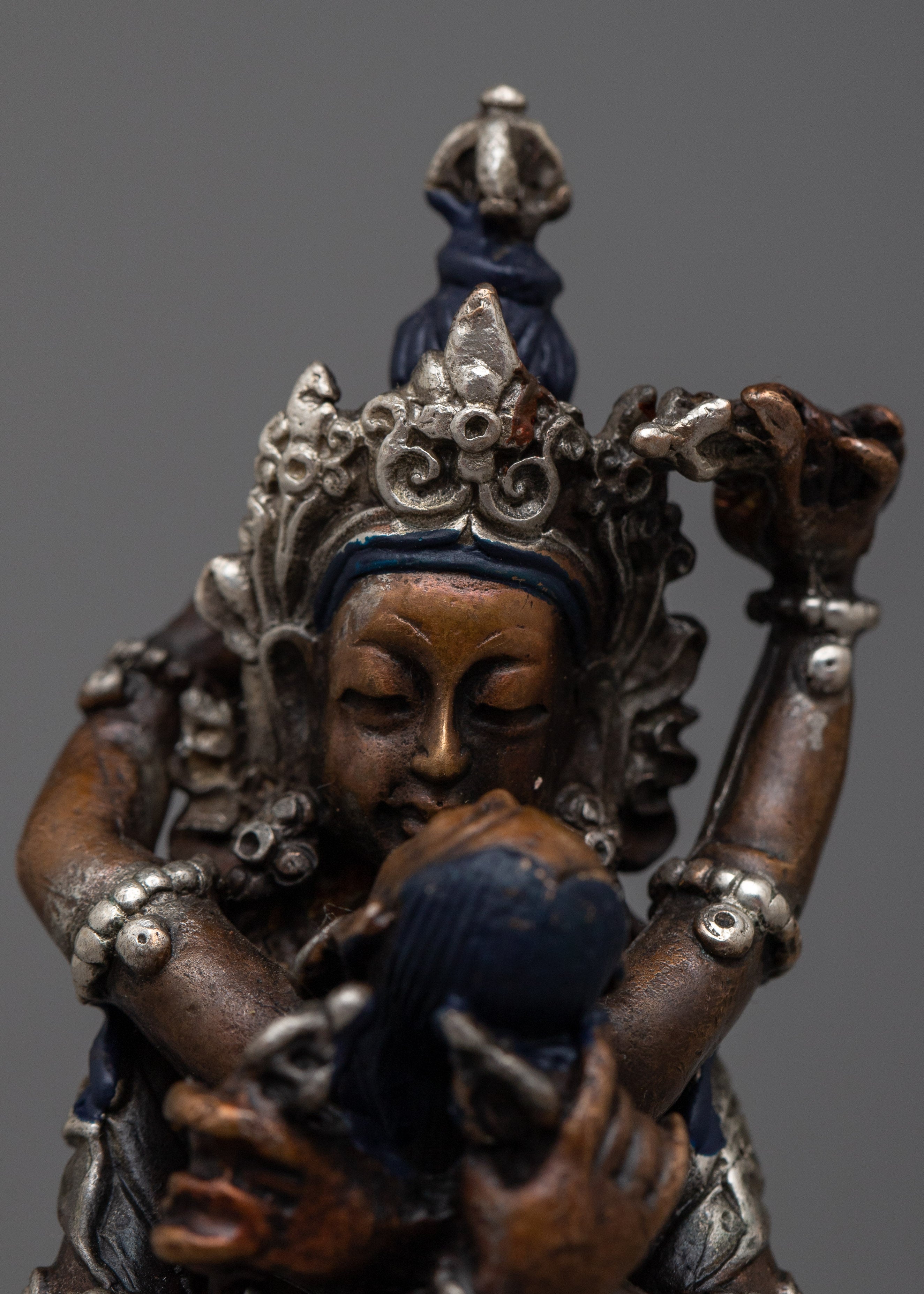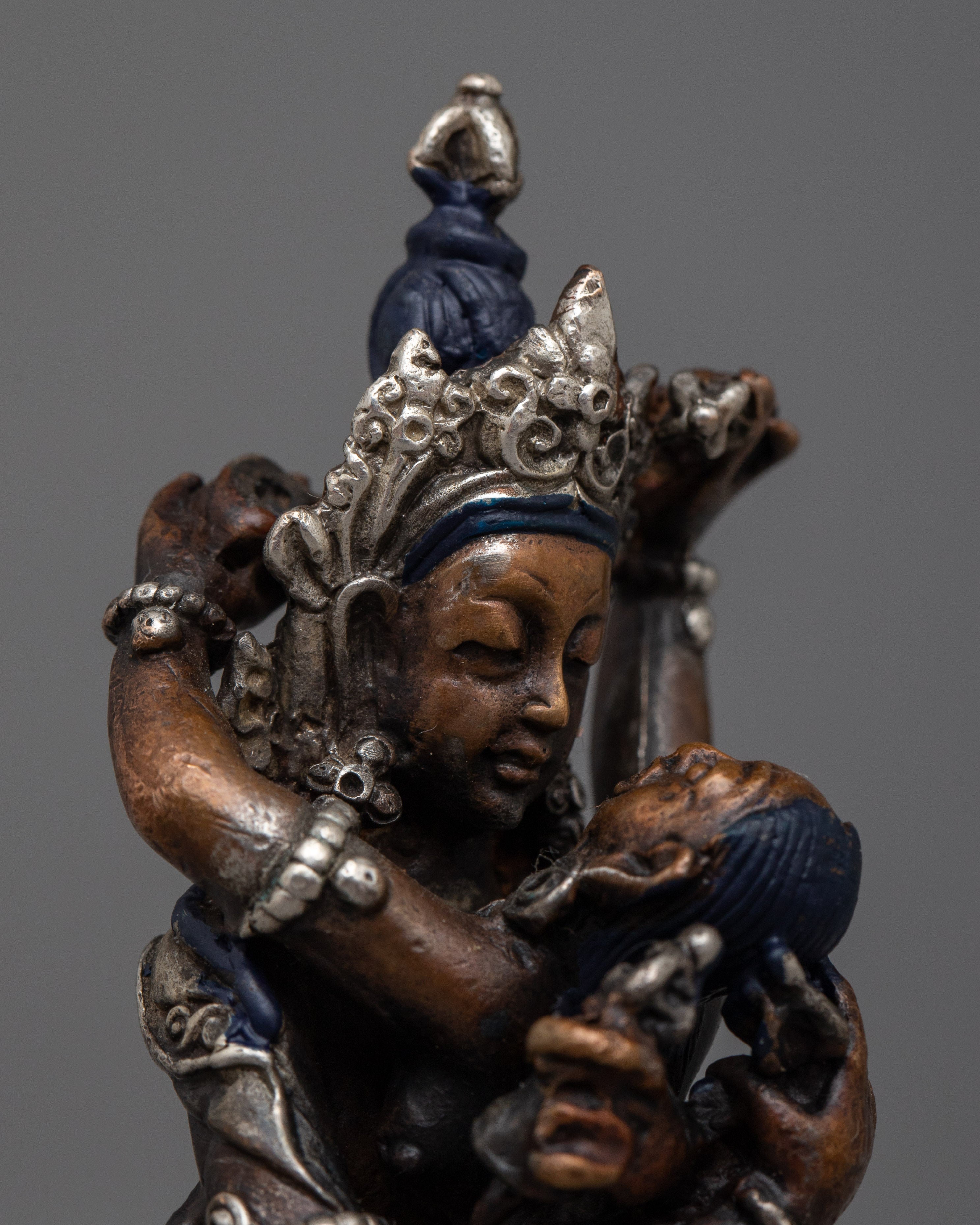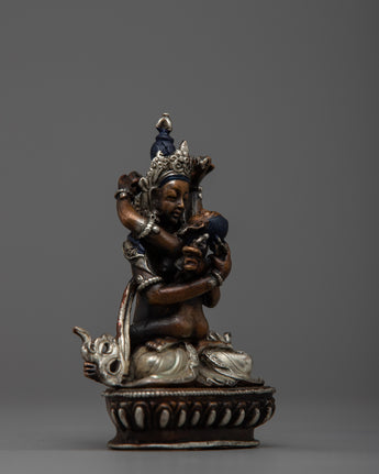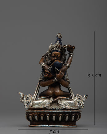 Discover the exquisitely constructed Vajradhara with Consort Statue, which is completed with a beautiful silver coating and is made of oxidized copper. This statue, which stands 9.5 cm tall, depicts the primordial Buddha Vajradhara in conjunction with his wife, signifying the fusion of compassion and wisdom. The figures' tranquil expressions and intricate details are emphasized by the silver plating, which also heightens their atmosphere of spirituality.