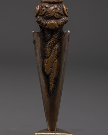 This Tibetan Vajrakilaya Phurba Ritual Dagger is 24 cm tall, 6.5 cm broad, and weighs around 0.58 kg. It is meticulously fashioned from copper and iron and stands on a handcarved base, which adds to its strength and magnificence. The use of metals showcases the delicate etching and complex motifs, making it a stunning and powerful addition to any Tibetan altar or meditation room. Its small size enables convenient exhibition while preserving its ritual significance.