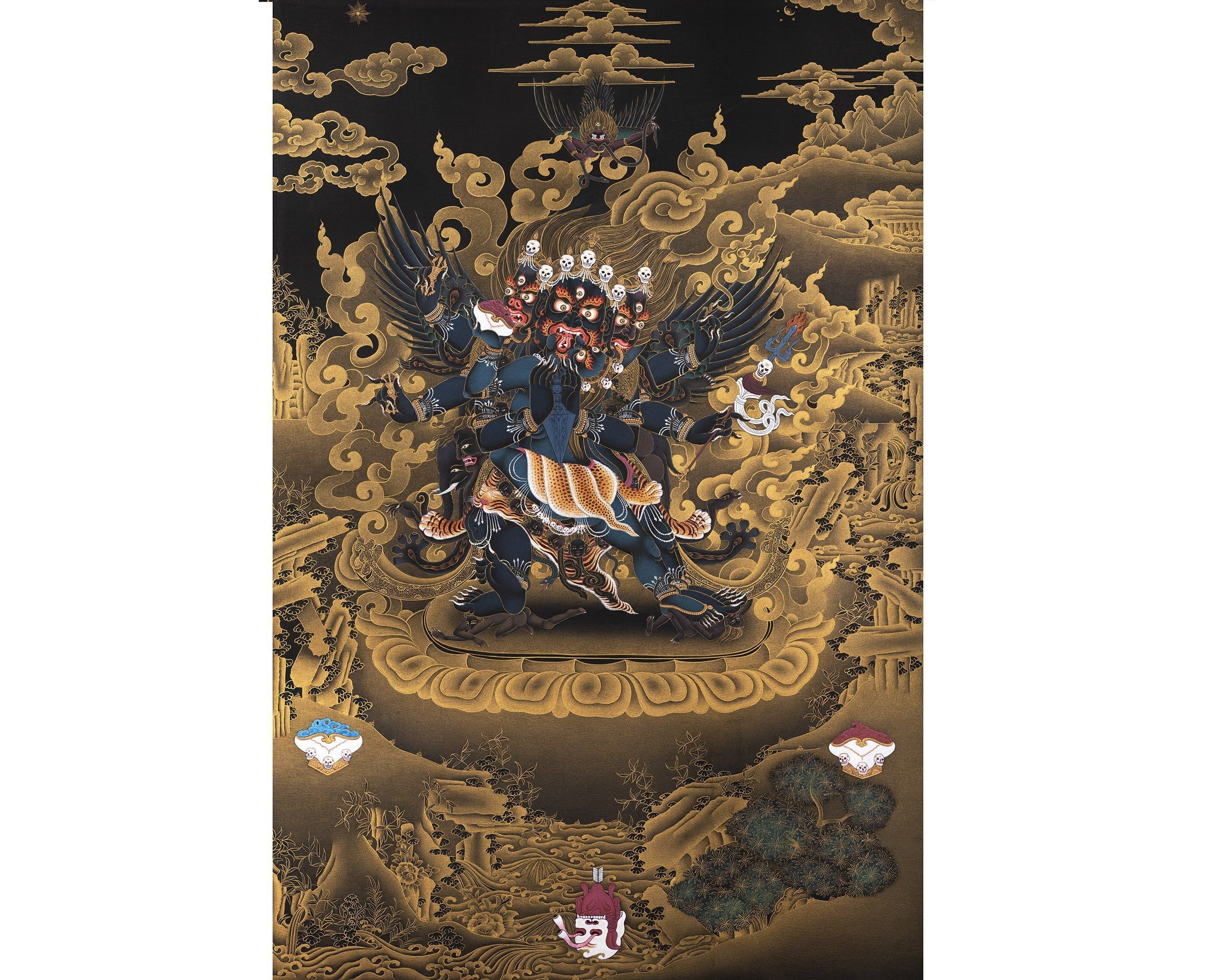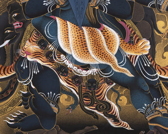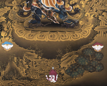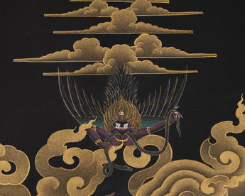 The Vajrakilaya thangka (Vajra Kilaya, Dorje Phurba) painting is a recent addition to our collection, made for the practitioner. The vivid and contrasting tones of Black and Gold used in this thangka will help you to focus your concentration while meditating.