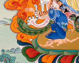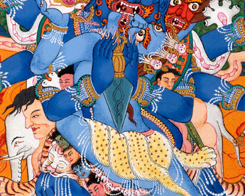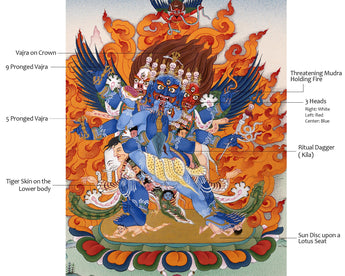 The Thangka portrays Yidam Vajrakilaya, who is the Buddha Vajrasattva's wrathful form. His characteristic iconographic feature is that he wields the phurba or kla dagger. Vajrakilaya is typically depicted as a crown of skulls with three faces of various hues. The middle face is blue, while the left and right fronts are red and white. He also has six arms, two of which wield the phurba, two of which each hold one vajra, one of which has a blazing snare, and one of which contains a trident. He smashes demons that symbolize the impediments to spiritual development under his feet.