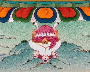 When the Buddha settled under the Bodhi Tree, determined not to rise until he had attained awakening, no sooner had Guru Padmasambhava settled down to practice with his consort than powerful demons beset them. These forces plunged the whole country into famine, plague, and chaos. These forces stopped the rains for three years so that famine, disease, and suffering spread like wildfire throughout India, Nepal, and Tibet, killing humans and livestock alike. These were desperate times for the region and indeed is often said that the more profound the practice, the more menacing the obstacles.