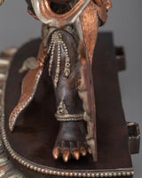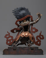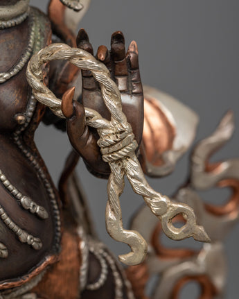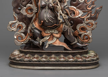 With our Vajrapani Bodhisattva Art, you may bring the manifestation of spiritual strength and heavenly energy into your home. This statue stands 12.7 inches tall and 9.4 inches wide, making it an ideal addition to your shrine, house, or meditation place. The statue is made of an oxidized copper body that has been silver-plated, representing the long heritage of Buddhist craftsmanship and giving it a distinct antique appearance.