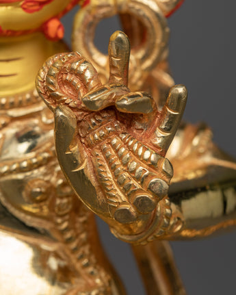 In a dynamic position that symbolizes his duty as the protector of Dharma, Vajrapani is seen holding the thunderbolt, or vajra, in his right hand, which stands for the ability to slay ignorance. The 24K gold gilding highlights his divine energy, symbolizing unwavering strength and spiritual resilience, while the intricate details and vibrant colors of the acrylic paintings emphasize his formidable presence.