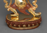 Introducing the Vajrapani Bodhisattva Idol, a representation of the Buddha's strength and his guardian. This idol, which stands 11 inches tall on an 8.6-inch base and weighs 2.12 kg, perfectly embodies the powerful and unwavering spirit of Vajrapani. With its oxidized copper body that evokes a timeless vibe and its 24K gold gilding, intricate gold and acrylic paintings, this item highlights the vajrapani's magnificent and protective character.