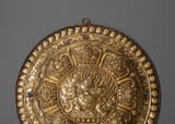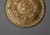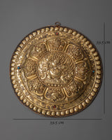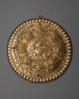 Elevate your spiritual environment with this Vajrapani Bodhisattva Wall Hanging, which measures 39.5cm in height and width. This wall hanging, made of brass and studded with artificial stones like turquoise and coral, beautifully reflects the strong yet loving force of Vajrapani, the Buddhist guardian and guide. The meticulous design of Vajrapani's features and position demonstrates exceptional craftsmanship, making it an eye-catching centerpiece for any meditation room, altar, or holy location.