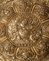 This wall hanging features eight fortunate symbols, each representing a great spiritual blessing, such as wisdom, protection, prosperity, and harmony. The use of brilliant turquoise and coral stones underlines these religious symbols, providing a stunning contrast to the warm brass finish. Every aspect, from Vajrapani's furious look to the elaborate decorative motifs, has been carefully planned to portray spiritual strength and harmony. This piece not only complements your decor, but it also functions as a sign of guidance and protection. This Vajrapani Bodhisattva Wall Hanging, ideal for creating a tranquil and spiritually charged environment, brings peace, mindfulness, and positive energy into your home or meditation room. Place it on a wall, over an altar, or in a quiet area for thought. This wall hanging, which features 8 auspicious symbols, brass construction, and turquoise and coral embellishments, is a meaningful way to celebrate Vajrapani's protective presence while also enhancing your spiritual practice.