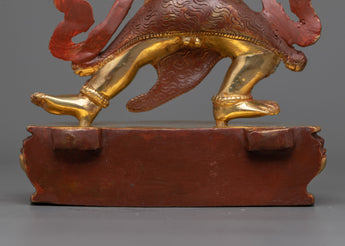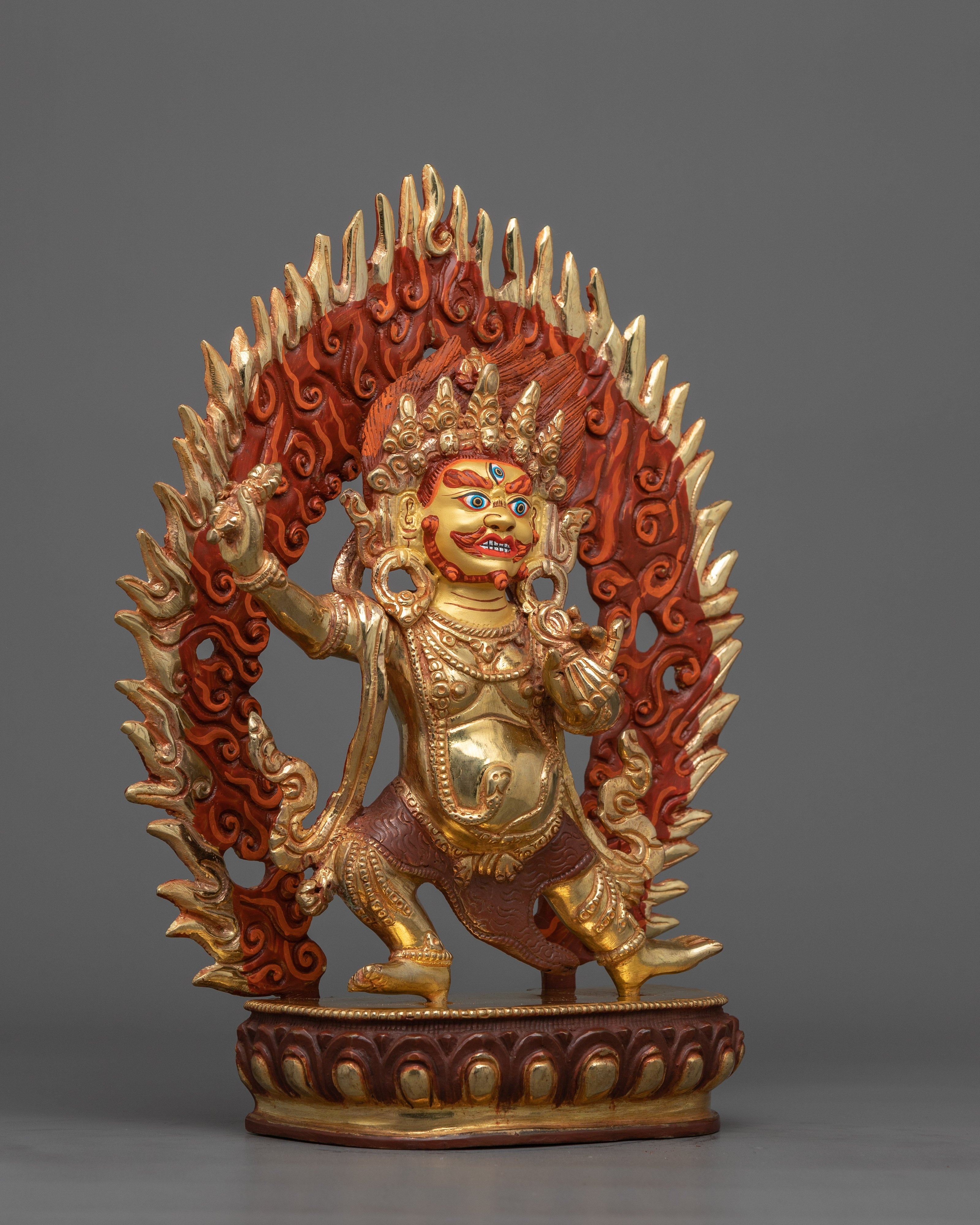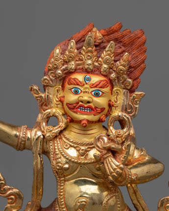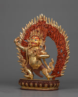Vajrapani, also known as Chana Dorje in Tibetan defenders of the Buddha's tantric teachings, exemplifies the powerful energy that combats ignorance and obstacles. He is depicted standing with a wrathful expression, holding a vajra in his right hand and a lasso in the other was sculpted on a copper body and then gilded in genuine 24k gold.