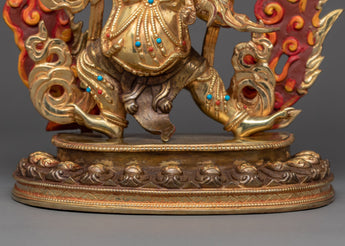 We have traditionally hand carved the sculpture of Vajrapani in a copper body gilded with genuine 24k gold and finely hand painted with acrylic colors. In this Buddhist statue, we have portrayed a deity standing on top of a sun disc lotus seat with a wrathful expression. We have magnificently adorned the ornaments with precious turquoise and gemstones. He holds a vajra in his right hand while he holds a lasso in his left hand, which makes the menacing mudra. We assure you that the materials used in this statue are of high quality and will endure for many years without any damage or scratches. You can use this statue in different Buddhist rituals, your regular meditational or yoga activities, and in home décor. This art of Himalayan from Nepal will be a great gift to a practitioner like you.