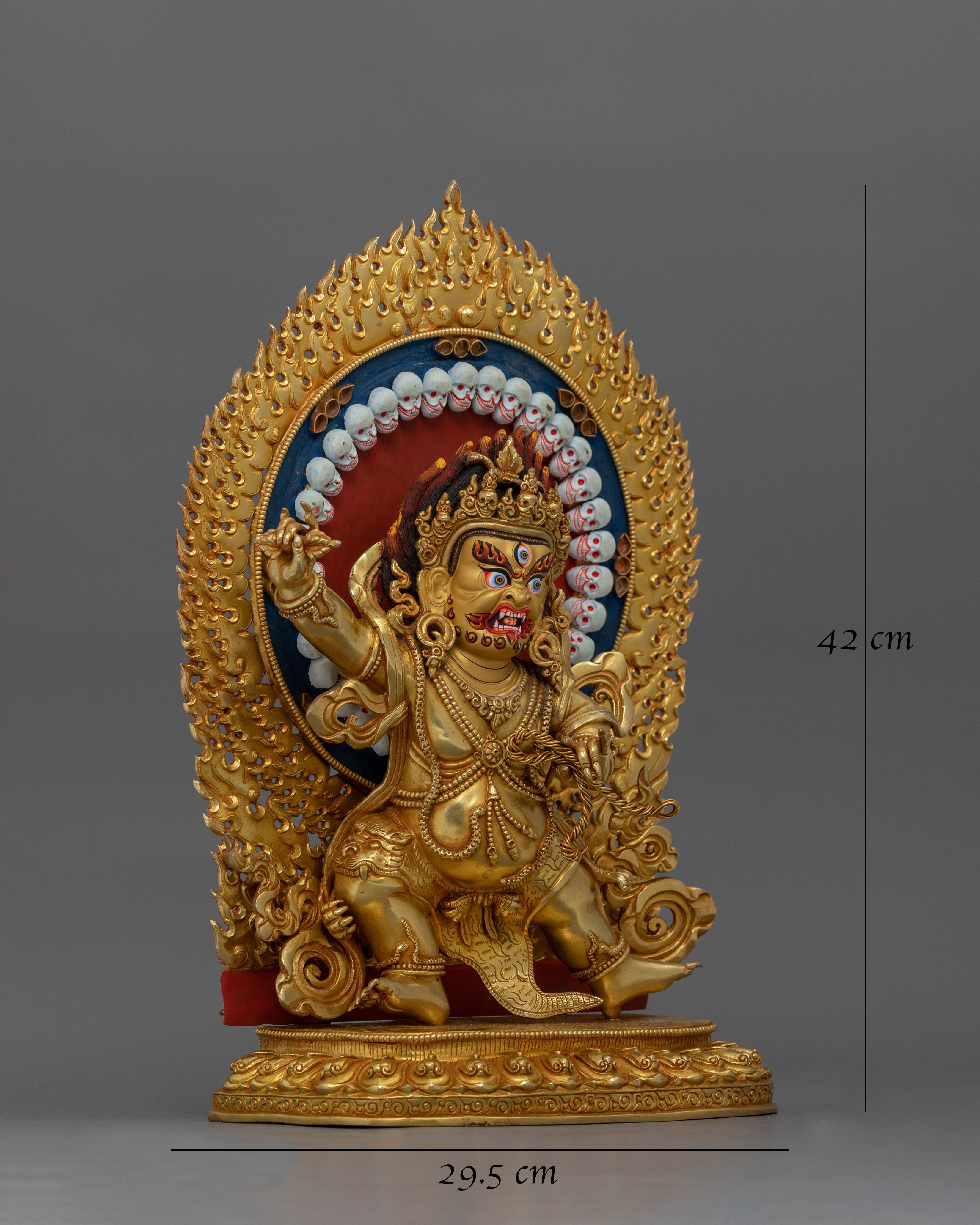 This Vajrapani Shakyamuni's Protector Statue is 16.5 inches tall, made from copper, and embellished with beautiful 24K gold gilding. This statue, enhanced with bright gold and acrylic paints, represents Vajrapani's powerful protective spirit as the protector of Shakyamuni Buddha and embodiment of the Buddha's might.