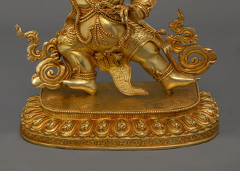 Vajrapani is shown in his wrathful form, holding a vajra (thunderbolt) to symbolize his duty as the guardian of Dharma and destroyer of ignorance. His dynamic stance and fierce expression demonstrate his unshakeable dedication to defending the Buddha's teachings and those who follow them. The glittering gold detailing, paired with the elaborate painting work, heightens the deity's regal aspect, making this statue an effective spiritual instrument for summoning protection and inner strength.