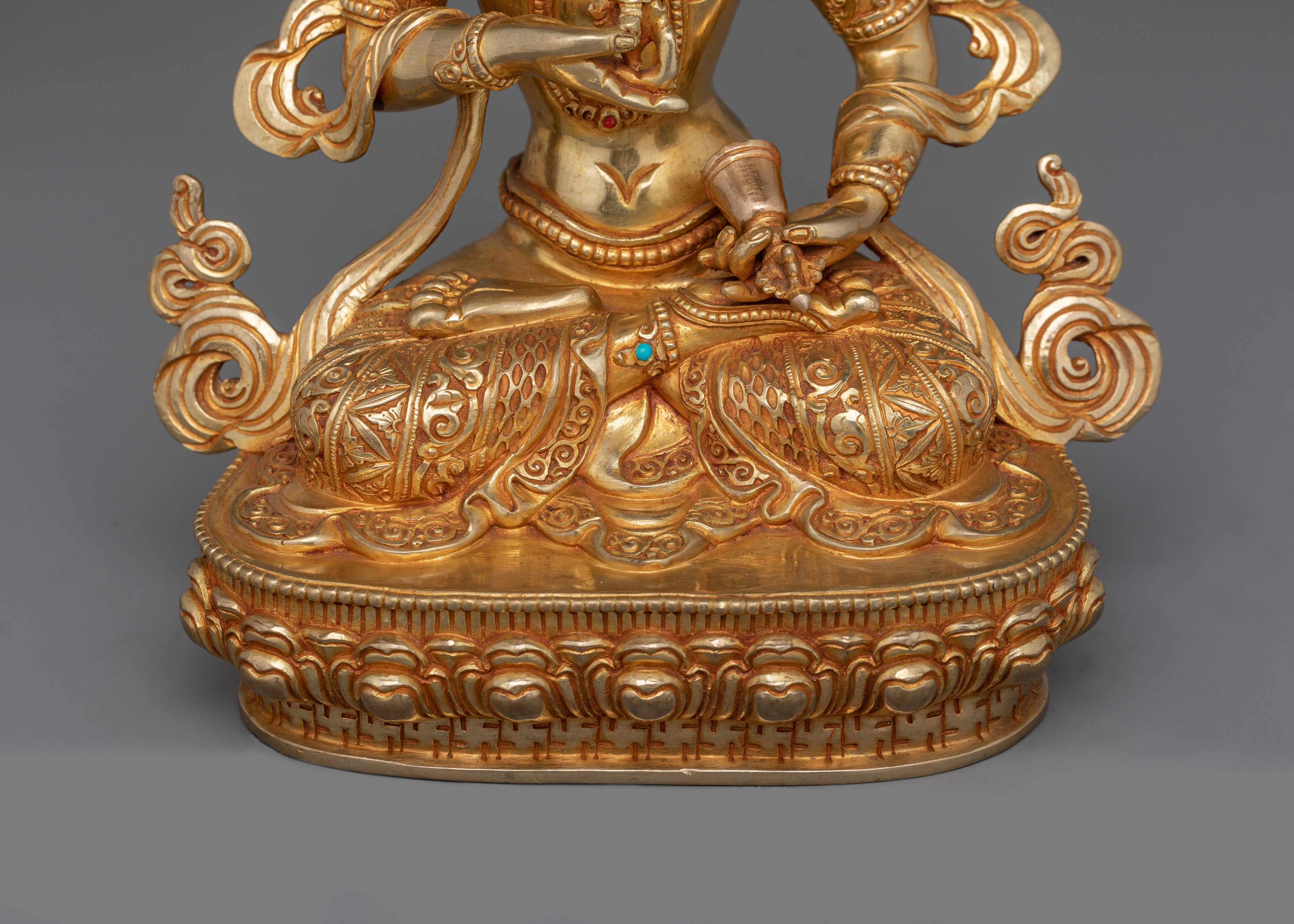 Vajrasattva is represented as a figure holding the vajra in his right hand and the bell in his left, both of which are muted against his thigh. Together, these two items express the essential unity of kindness and knowledge on the path to enlightenment. His calm and serene face represents the tranquility of a mind free from pain, making this statue an important piece for spiritual practitioners and ritual places.
