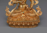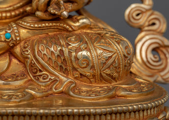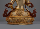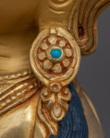 The profound balance of wisdom and compassion in Newar Buddhist rituals is symbolized by this crafted Vajrasattva A Symbol of Insight statue, which stands at a height of 9.8 inches and has a 7.1-inch base. The statue is 2.16 kg in weight and its copper body is gilded in 24K gold, with gemstones and gold-acrylic paints are used for decorating the sacred object. The statue represents purity, spiritual understanding, and enlightenment, embodied in a calm, contemplative appearance.