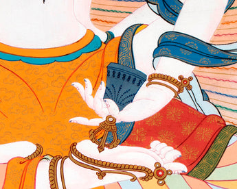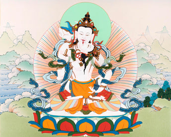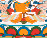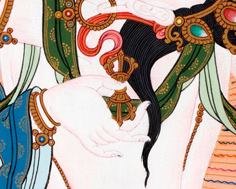 Our traditionally skilled Karma Gadri artisans have created a magnificent Vajrasattva Yab Yum Thangka. Dorje Sempa and Consort's white face is highlighted by an orange halo with delicately patterned gold. Dorje Sempa carries a Vajra in his right hand, and a bell left. The vajra denotes compassion, while the bell represents wisdom. He sits serenely on a moon disc atop a lotus seat, his legs crossed, suggesting that he stayed untouched by the unclean cycle of samsara for the sake of sentient creatures.