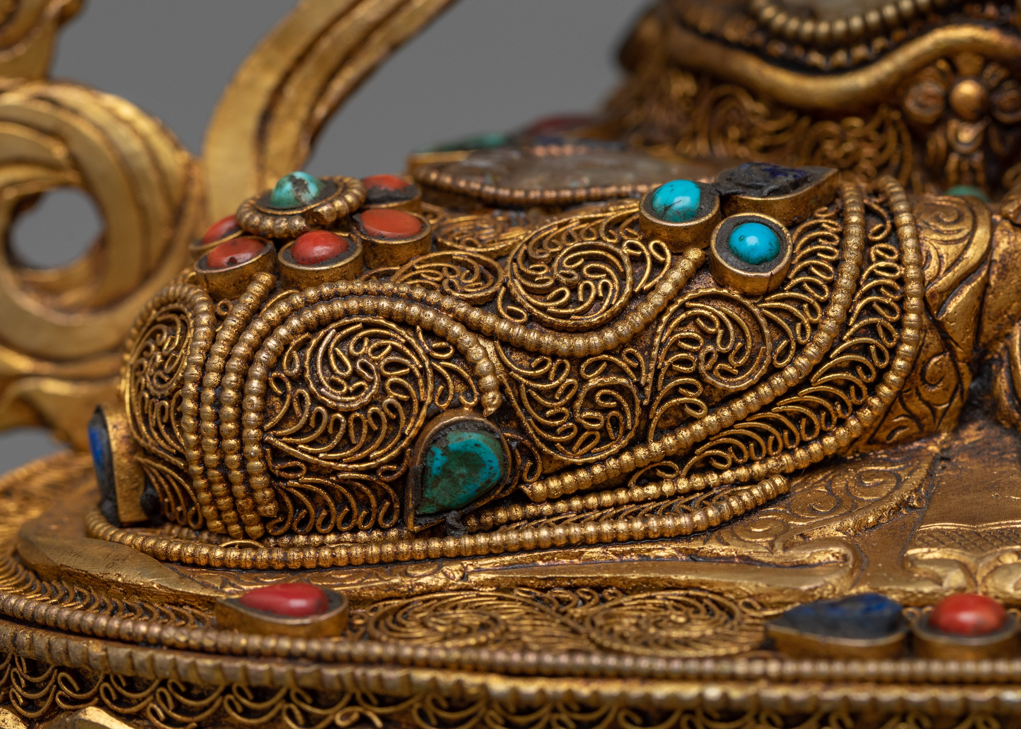 Every side is adorned with exquisite inlays of priceless turquoise, lapis lazuli, and coral stones, all with deep symbolic and spiritual meaning. Lapis lazuli reflects truth and wisdom; coral denotes vitality and purification, and turquoise stands for peace and spiritual equilibrium. They combine to create a harmonious fusion of energies, leading practitioners toward liberation and spiritual awakening.
