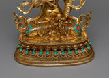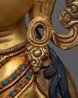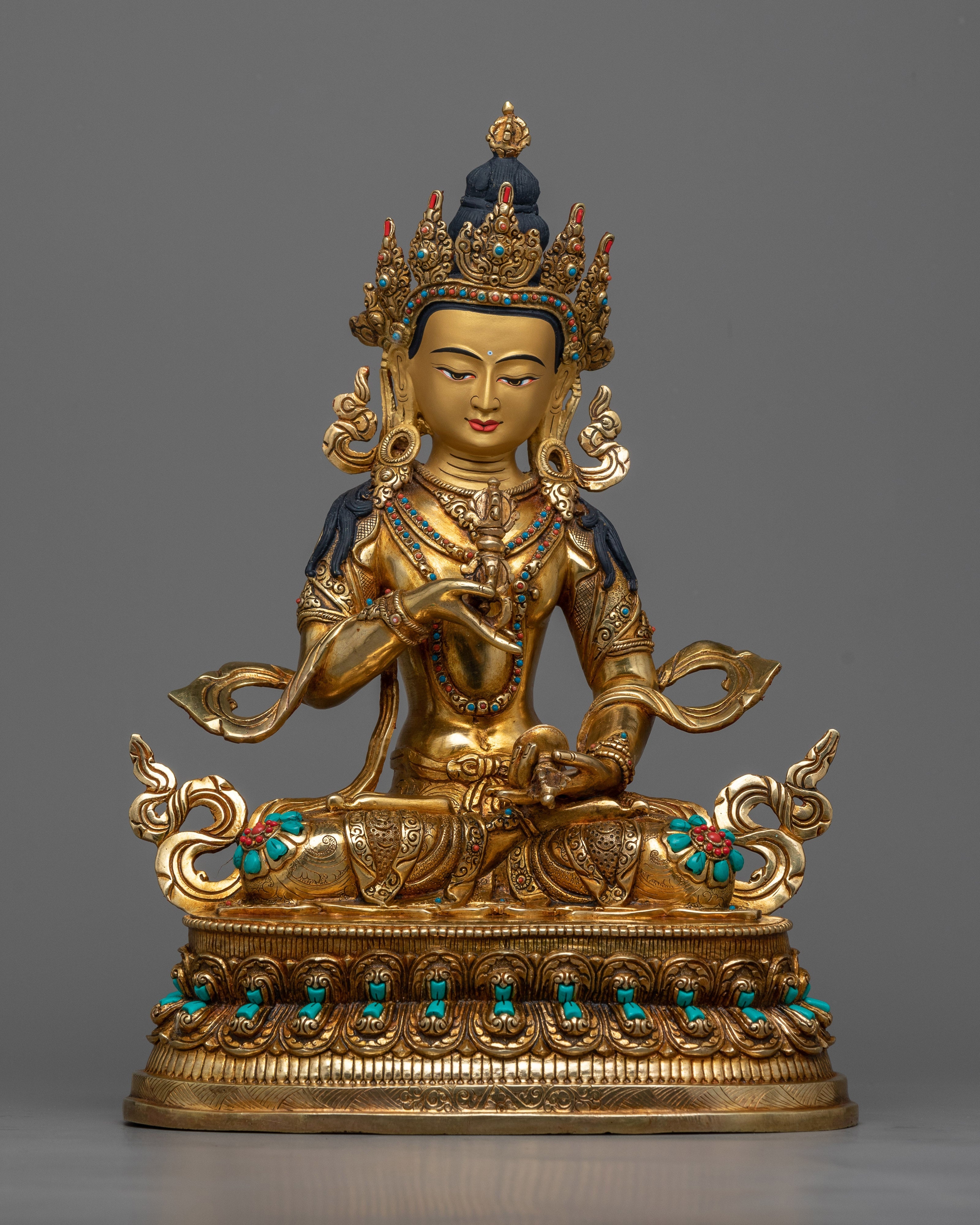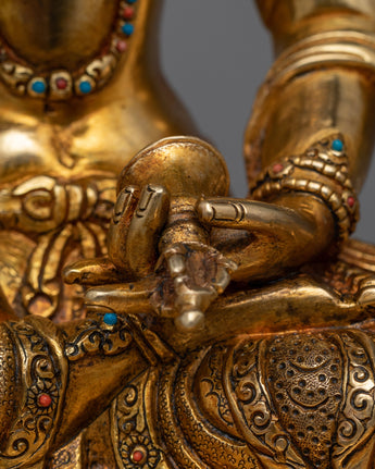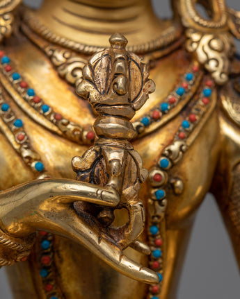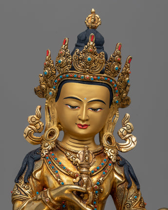 Introducing the magnificent sculpture of Vajrasattva Bodhisattva for the Buddhist Shrine. Vajrasattva is a deity linked to the clearing of negative karma and the embodiment of the Buddha's pure intellect. This sculpture, which is 13. inches tall, rests on a 9.4-inch base and weighs 3.04 kg. This masterwork of spiritual workmanship illustrates the problematic route to enlightenment via purification. This exquisite piece, enhanced by hand-carved jewels and features a copper body gilded in 24K gold, reflects the radiant purity and unbounded compassion of the Vajrasattva. It is also embellished with paintings in gold and acrylic.