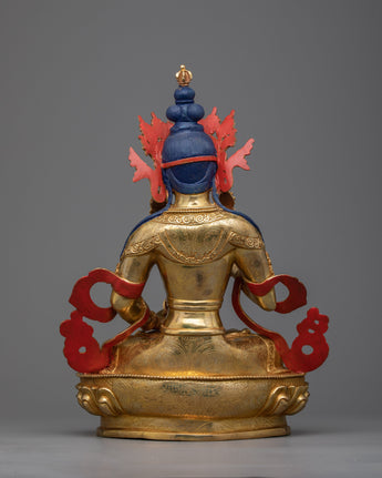 Set out on a spiritual quest with this statue of the Vajrasattva Buddhist Deity Art. This handcrafted Sculpture, which stands 14.1" in height and rests on a 9.8" base, is a symbol of tranquility and knowledge. This statue is a compelling addition to any shrine or sacred space thanks to the bright combination of 24k gold gilding and acrylic paintings on a sturdy copper body weighing 4.01 kg. Our statue is painstakingly created in Nepal, displaying an amazing level of craftsmanship and paying homage to the local traditional art. This statue's intricate portrayal of Vajrasattva represents the deity's purity and potential for enlightenment, serving as a never-ending source of motivation for your spiritual journey.