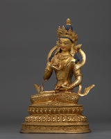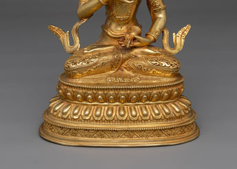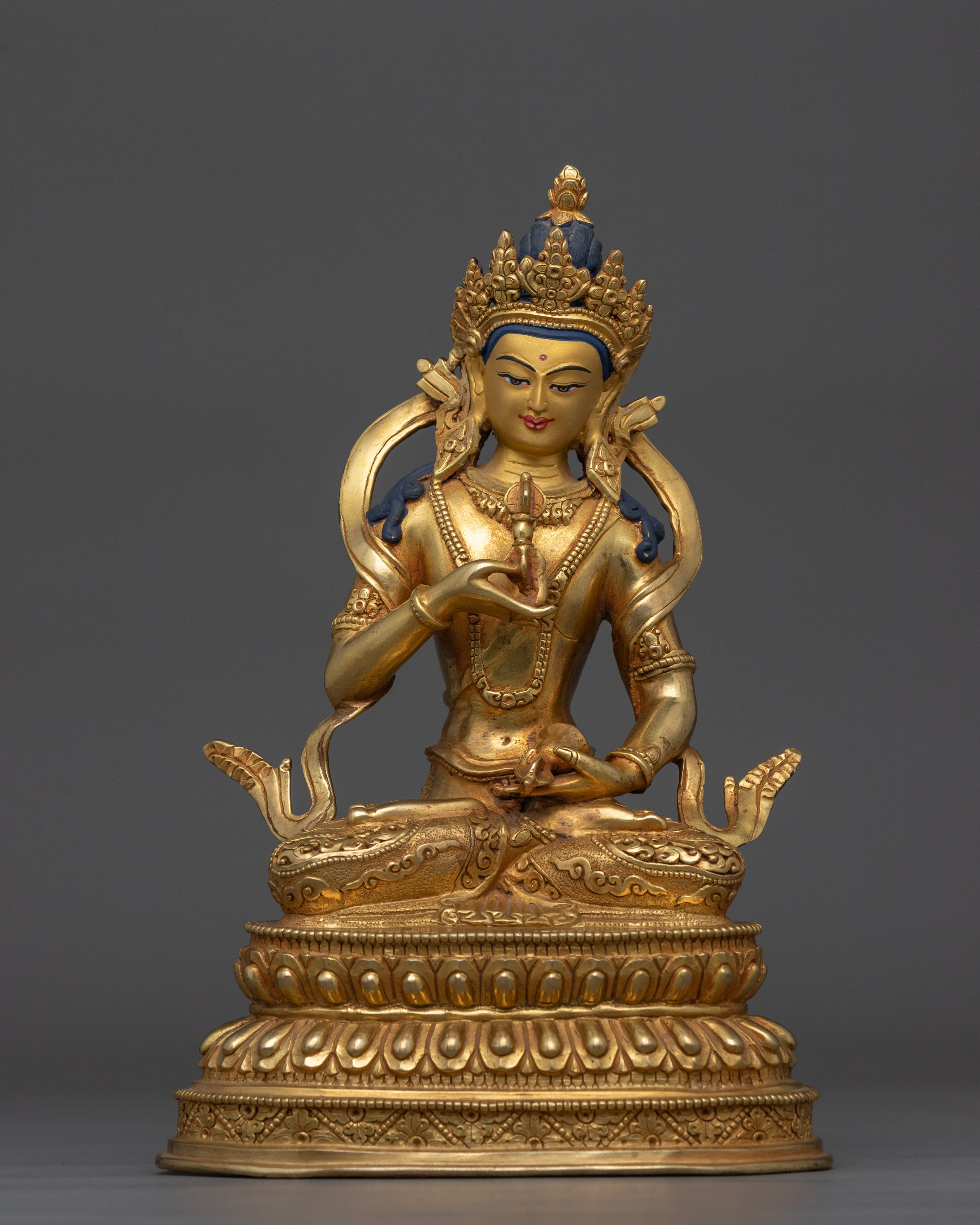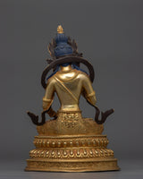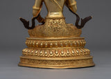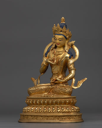 The Vajrasattva Buddhist Purification Figurine is the lord of purification in Vajrayana Buddhism, known for his role in removing impurities and obstacles, both physical and spiritual. This well constructed sculpture weighs 1.90 kg and is 9.4"/24cm in height with a base width of 6.5"/16.5cm. It is made of copper, gilded with 24K gold, and embellished with gold and acrylic paints to highlight the delicate details of Vajrasattva's peaceful and strong form. It is an effective spiritual tool for cleansing and the elimination of negative influences.