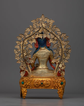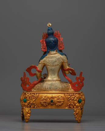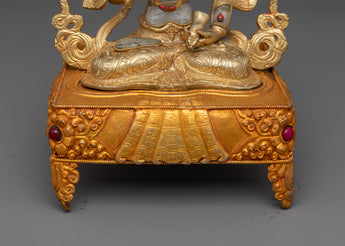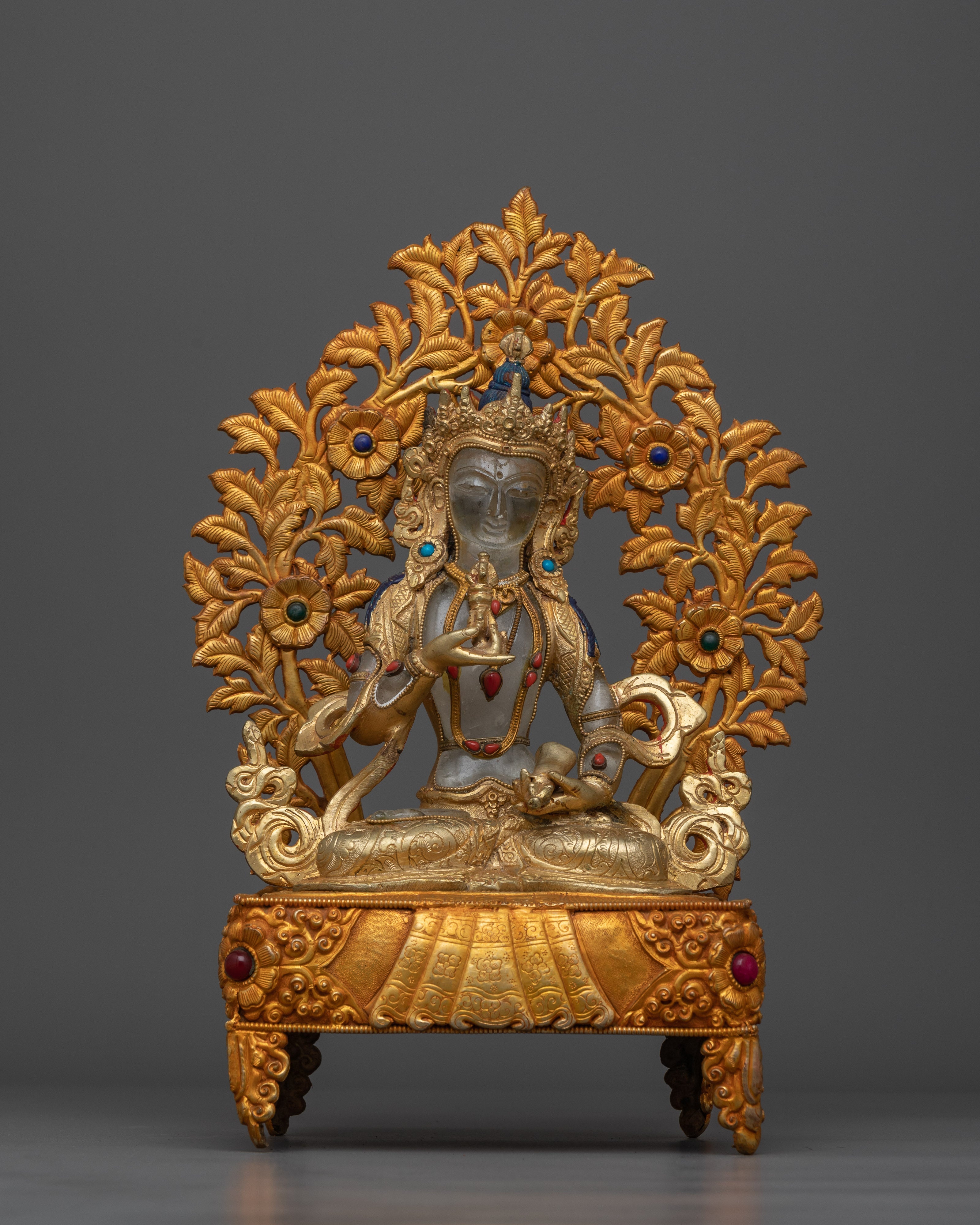The extraordinarily clear and luminous crystal body of this statue collects and reflects light in a captivating exhibition, signifying the role of Vajrasattva in enlightenment and purification. The delicate intricacies of Vajrasattva's attire and qualities, such the vajra (thunderbolt), are highlighted by the 24K gold gilding, which also adds to the statue's visual appeal and spiritual importance. Its substantial yet gracefully poised presence, weighing 1.58 kg, makes it a perfect complement to any meditation area, altar, or reflective spot.