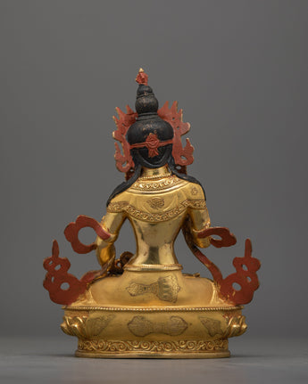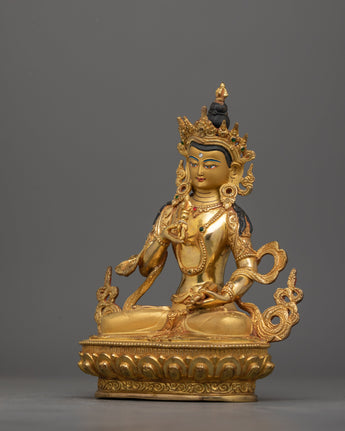 Vajrasattva, the embodiment of enlightenment and purity in Vajrayana Buddhism, is portrayed in this gilded statue holding a ghanta in his left hand and a vajra in his right, signifying the union of wisdom and compassion. He is crowned with a five-pointed crown that commemorates the five Dhyani Buddhas and the essence of the Buddha's teachings. Vajrasattva sits on a double lotus base in a meditative posture. His calm demeanor and holy decorations symbolize his transcendent, enlightened nature and his function in assisting beings in achieving spiritual purity.