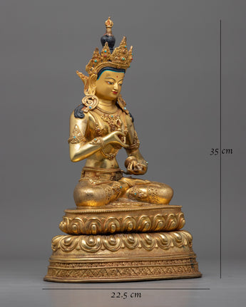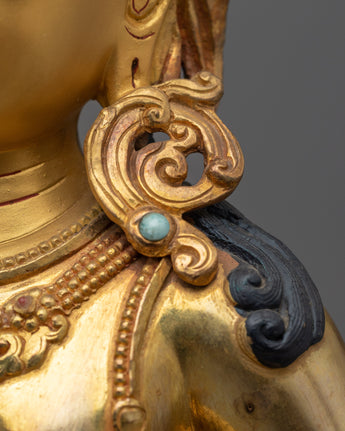 Experience the fine artistry of the Vajrasattva Figurine, expertly carved by skilled artisans. The sculpture is made of copper and measures 13.8 inches tall by 8.9 inches at the base. It is adorned with elaborate paintings in gold and acrylic and is gilded in 24K gold. The dexterous rendering of every detail displays the spiritual purity and wisdom of Vajrasattva, thereby encouraging practitioners to go on a more profound spiritual path. A tangible representation of spiritual enlightenment, the craftsmanship exudes a sublime grace and refinement.