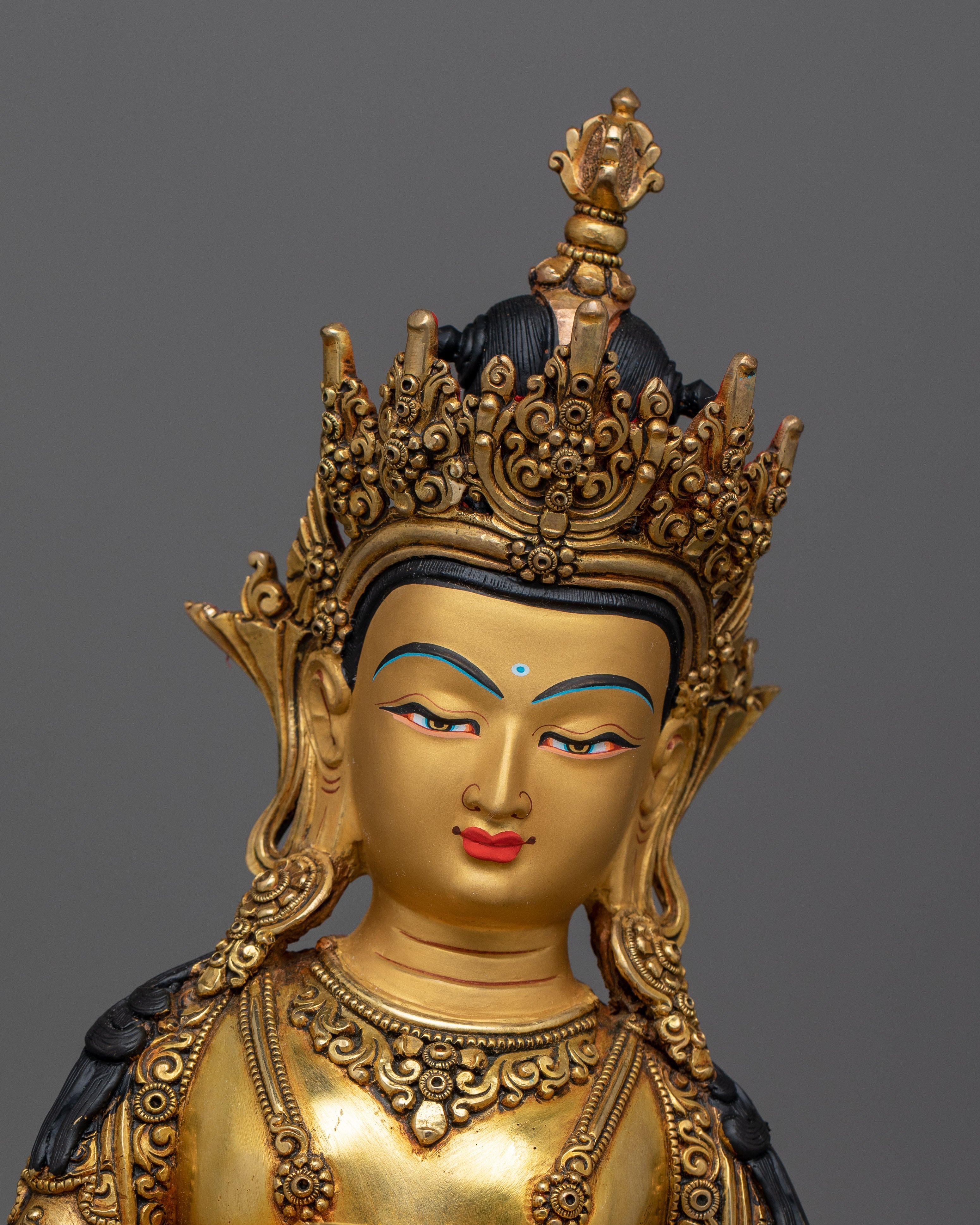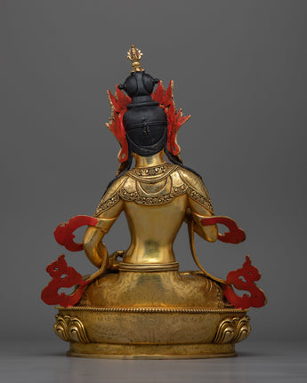 The amazing intricacies of Vajrasattva's elaborate robes and serene expression are accentuated by the statue's luxurious handiwork, which is composed of a copper body finely gilded in 24K gold. The statue's gold and acrylic paintings enhance its appearance by giving it more depth and brightness, and they also highlight its symbolic features, including the vajra (thunderbolt) he is holding, which stands for the ability to vanquish ignorance in all its forms. Its considerable presence, enhanced by its weight of 4.09 kg, adds to its spiritual significance, making it a focal point in meditation rooms, altars, or as a unique decorative element in a house or business.